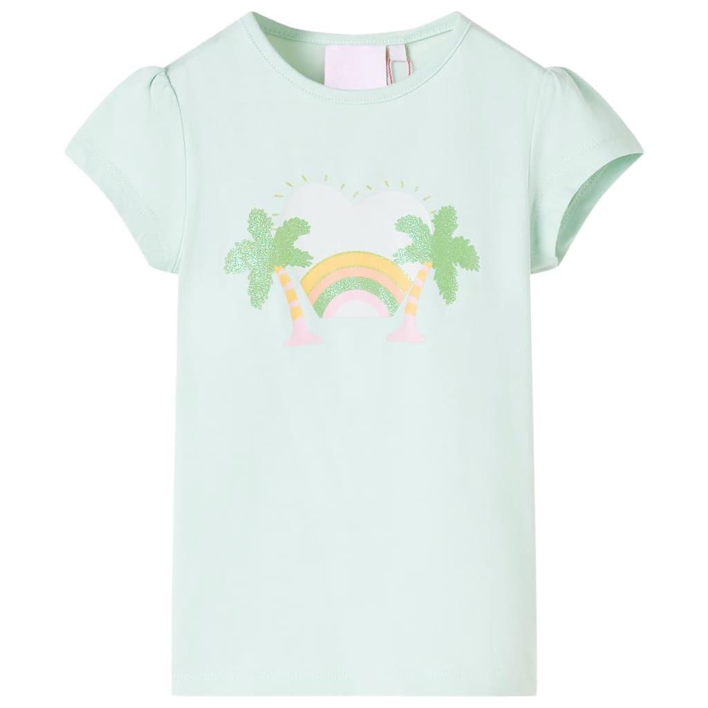 Dieses Kinder-T-Shirt hat kurze Ärmel, einen Rundhalsausschnitt und eine gerade Passform. Das T-Shirt ist mit einem Regenbogen und Palmen auf der Brust bedruckt. Zu 95 % aus Baumwolle und zu 5 % aus Elastan gefertigt, ist das Kurzarmshirt komfortabel und atmungsaktiv.