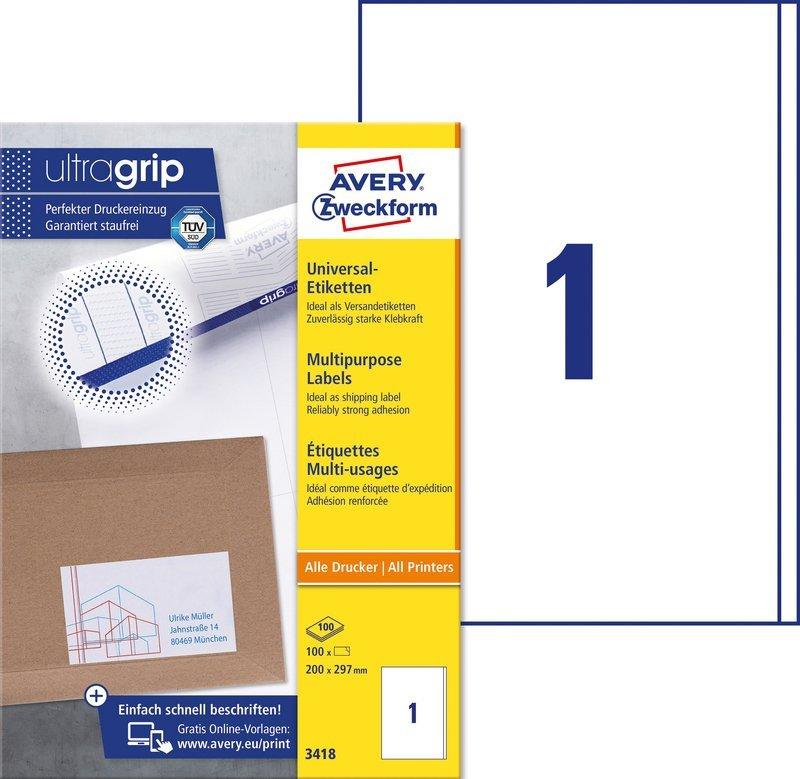 ULTRAGRIP - Universaletiketten weiss - 100 Bogen A4 Für alle gängigen Drucker und Kopierer geeignet, FSC-zertifiziert, mit der einzigartigen QuickPEEL-Abziehhilfe (QP) lassen sich die Etiketten einfach abziehen und schnell aufkleben. Dank der innovativen ultragrip-Technologie auf der Rückseite des Bogens können Sie sich auf einen ultrapräzisen Druckereinzug und absolut staufreien Druckerdurchlauf verlassen. Hier kommen Sie zur Designvorlage für Ihre Etiketten: https://www.avery-zweckform.com/etiketten-vorlagen