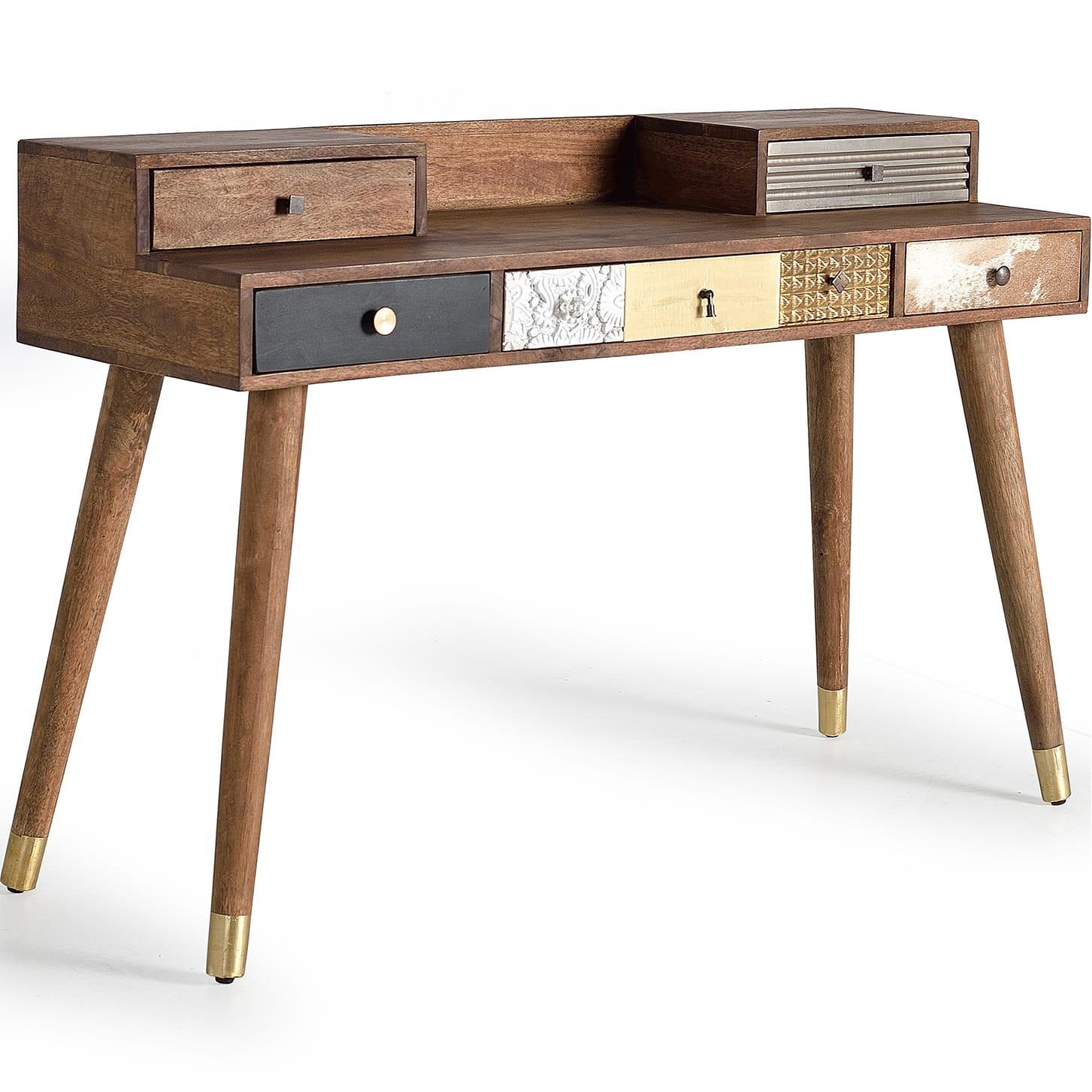 Der Schreibtisch aus Mangoholz bietet dank seiner fünf Schubladen viel Stauraum. Dieses Möbelstück ist nicht nur funktional, sondern auch ein echter Hingucker, der jedem Raum das gewisse Etwas verleiht.
