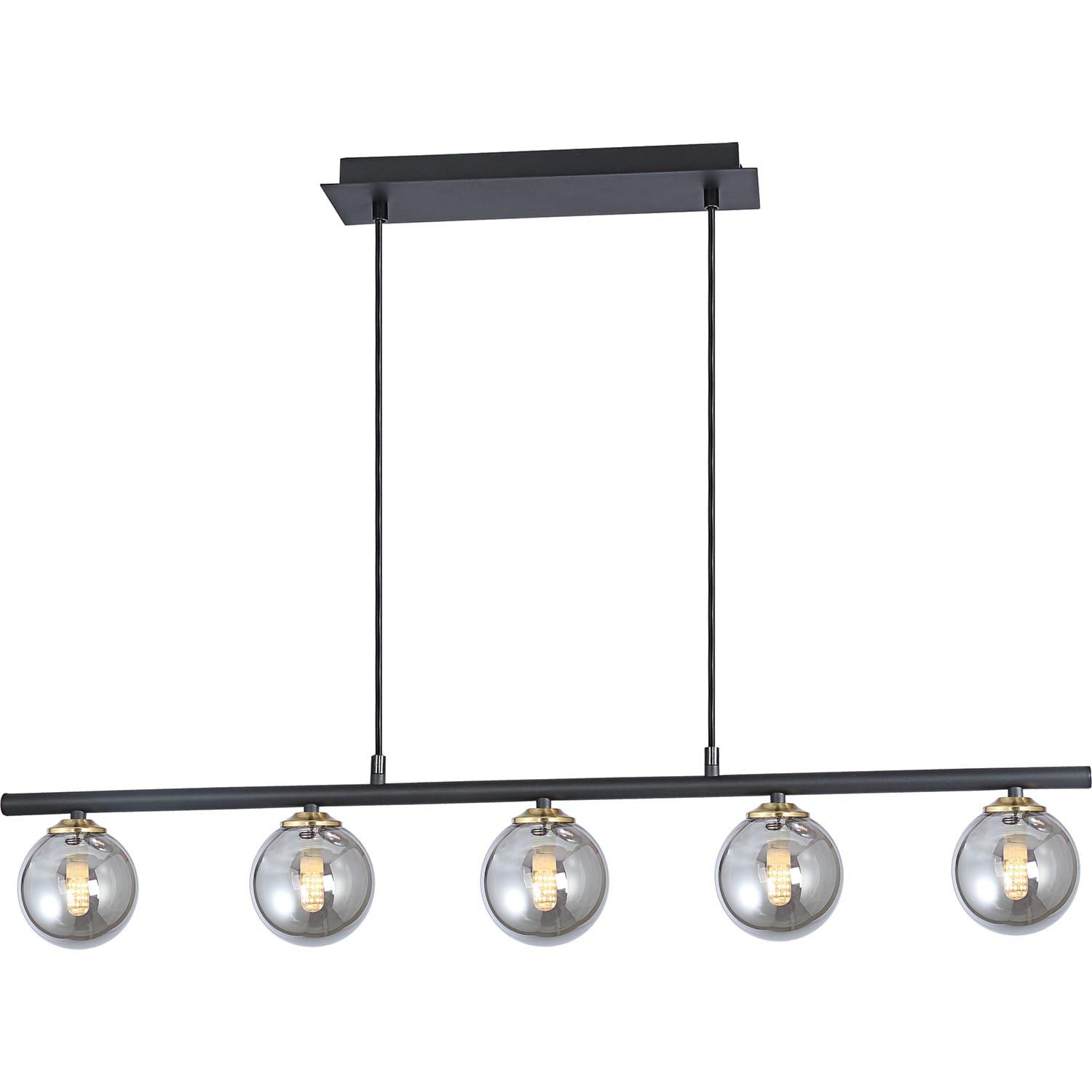Hängeleuchte Metall schwarz matt, Messing matt, Glas rauchfarben, Kabel PVC schwarz, LxBxH: 900x90x1200mm, exkl. 5x G9 25W 230V.