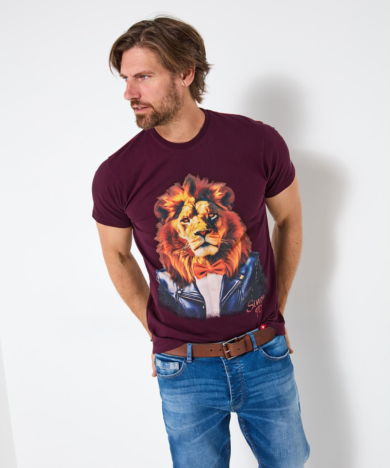 Dieses stilvolle T-Shirt präsentiert einen einzigartigen Grafikdruck eines Löwen in Jacke und Fliege, der jedem Freizeit-Outfit eine besondere Note verleiht. Der Doppelnaht-Saum sorgt für ein sauberes Finish und erhöhte Strapazierfähigkeit.
