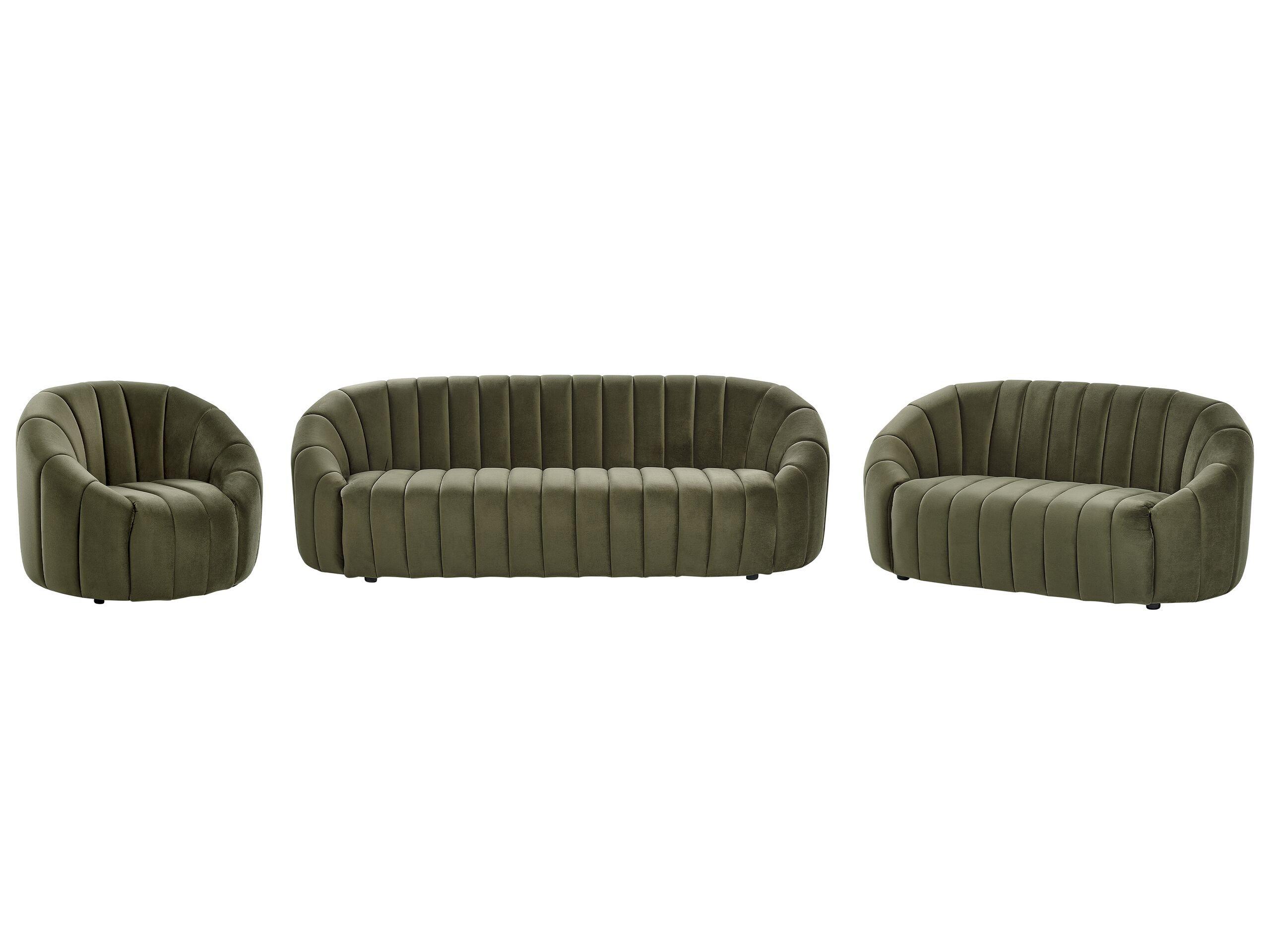 Zwei Samtsofas und ein Sessel mit breiten Sitzflächen und vertikalen Steppungen. Lassen Sie sich die Design-Schönheit und vortreffliche Gemütlichkeit dieser Sitzgruppe nicht entgehen. Ihre robuste Holzkonstruktion und niedrigen Kunststoffbeine versprechen Ihnen Stabilität beim Sitzen. Zudem verfügen sowohl die Sofas als auch der Sessel über einen Rundumbezug aus geschmeidigem Samtstoff, der in einem dunklen, matten Farbton gehalten ist. Für besondere Raffinesse sorgen ihre vertikal gesteppten Oberflächen und ihre geschwungenen Rückenlehnen. Ihre breiten Sitzflächen sind mit dicken Schaumstoffen ausgelegt und sind dabei auch besonders tief, so wirkt das gesamte Set nicht nur unheimlich gemütlich, sondern auch sehr edel. Setzen Sie auf dieses 3-teilige Sofa Set, das bis ins kleinste Detail verfeinert ist und bringen Sie einen unvergleichlichen Look in Ihren Wohnbereich.