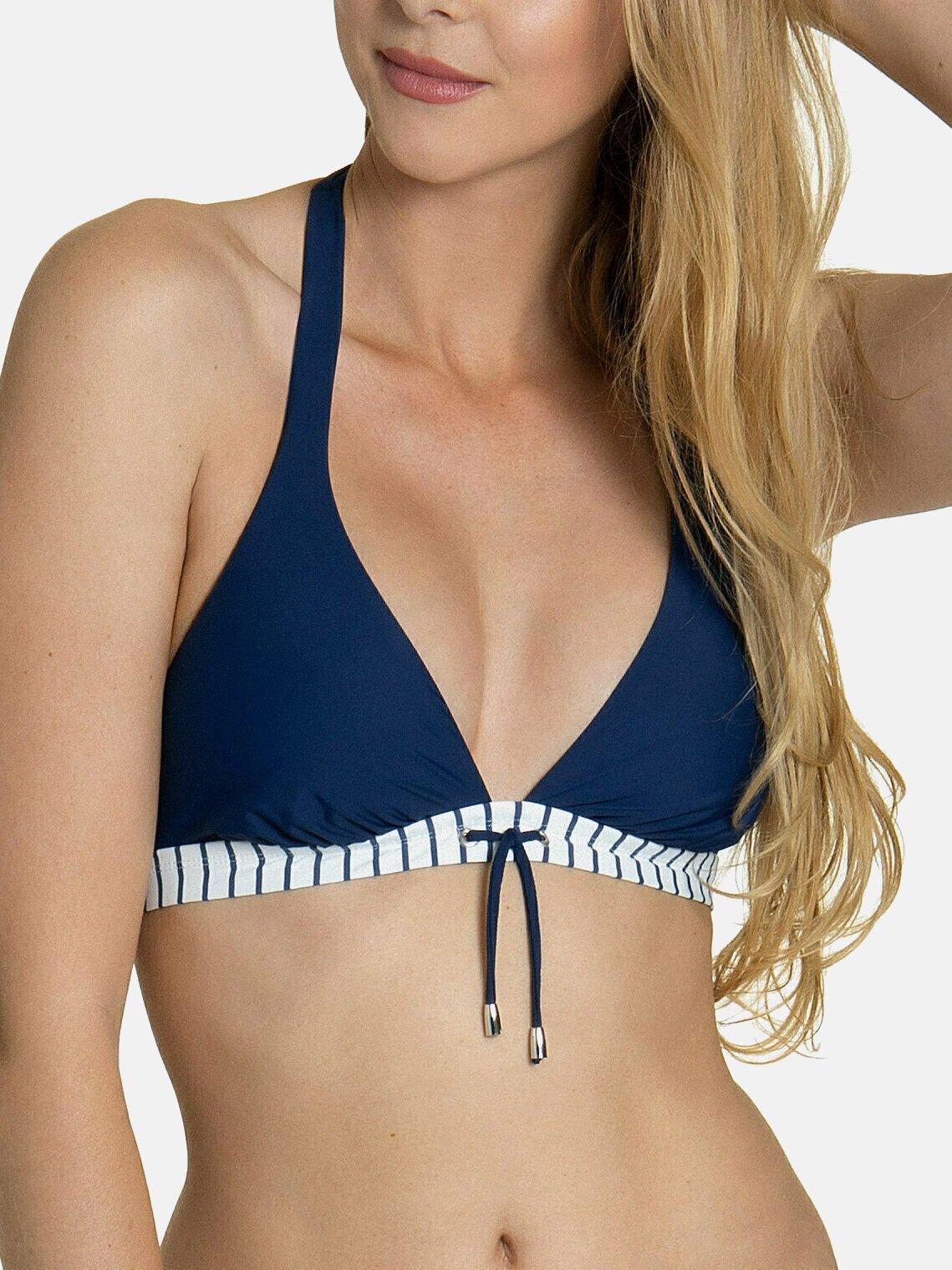 Dieses moderne Bikini-Oberteil verfügt über dreieckige Cups und ist ohne Bügel. Die gestreifte Umrandung unterhalb der Büste sorgt für einen jungen, verspielten Look, mit einem modernen Verschlussdetail inmitten von kleinen Bindebändern. Die Schaumstoff-Cups können auf Wunsch herausgenommen werden, um den Tragekomfort zu erhöhen. Drapierte Falten an den Cups bieten mehr Tiefe und Komfort. Die Neckholder-Träger werden im Nacken gebunden.