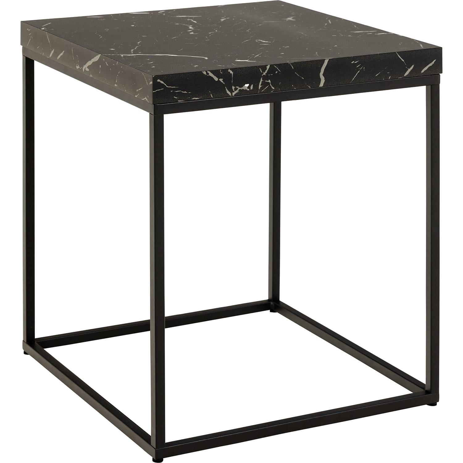 Modernes, quadratisches Design Dicke Tischplatte in edler schwarzer Marmoroptik Schlanker, stabiler Stahlsockel, matt schwarz pulverbeschichtet FSC zertifiziert für nachhaltige Herstellung Schonender Bodenschutz durch Filzgleiter Maximale Belastbarkeit von 20 kg Verwendete Materialien: Schwarzes Marmor Marquina Papier, pulverbeschichteter Stahl