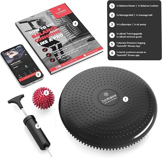 Das Set enthält: 1x Balance-Kissen 1x Massageball 1x Luftpumpe 1x eBook-Trainingsanleitung 1 Sumfit Fitness App 1 Monat Premium-Zugang zur Sumfit Fitness App
