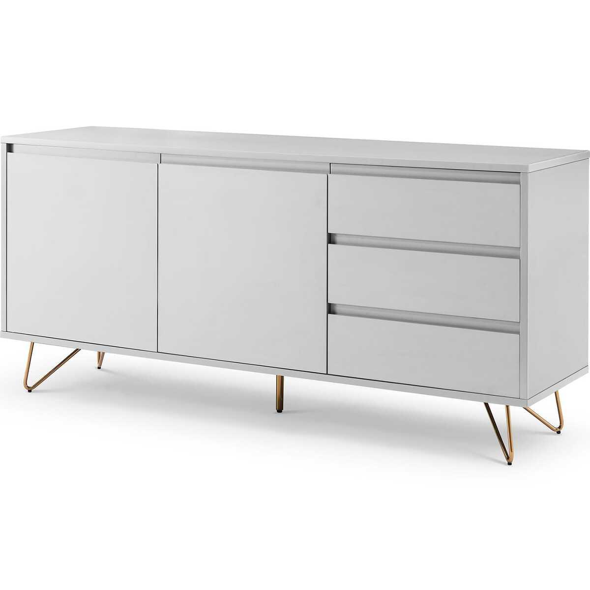 Ein echter Hingucker in Ihrem Wohnraum ist dieses Sideboard im skandinavischen Design. Die Kombination aus schlichten Farbtönen und goldenen Metallbeinen machen diese Kommode zu etwas ganz Besonderem. Dank zwei Schranktüren und drei ausziehbaren Schubladen erhalten Sie jede Menge stilvollen Stauraum für die alltäglichen Dinge. Hinter den beiden Türen verbergen sich zwei verstellbare Regalböden. Das moderne skandinavische Design dieses Sideboards ist auch morgen noch zeitgemäss und lässt sich wunderbar mit Ihren bereits vorhandenen Interior kombinieren.Stauraummasse Innenschublade: H10 x B47 x T35 cm, Masse Innenschrank B104 x T37 x H51 cm, mit 2 verstellbaren Regalablagen, 3 Schubladen ausziehbar, matt lackiert.Sideboard im skandinavischen Designin matt weisser Lackierungstylische Haarnadel-Beine mit Messinglegierungmit 2 Türen und 3 ausziehbaren Schubladen2 verstellbare Regalböden für mehr FlexibilitätSideboard aus MDF, Beine aus Metall mit Messinglegierung