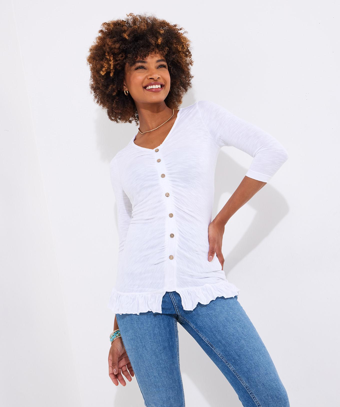 Dieses langärmelige Jersey-Top ist ein unverzichtbares Kleidungsstück für die Übergangszeit. Es verfügt über einen schmeichelhaften V-Ausschnitt und eine durchgehende Knopfleiste mit dekorativen Holzknöpfen. Die Vorderseite ist mit stilvollen Raffungen verziert, die einen strukturierten und eleganten Look erzeugen. Ein verspielter Rüschensaum verleiht diesem vielseitigen Top einen charmanten Abschluss.