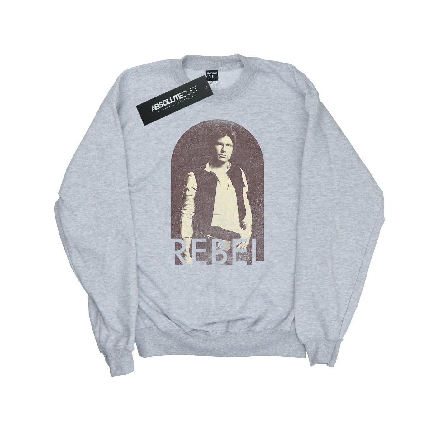 Dieses Sweatshirt verfügt über einen klassischen Rundhalsausschnitt und lange Ärmel und bietet eine bequeme und entspannte Passform. Die Vorderseite ist mit einem grafischen Druck von Han Solo und dem Wort „REBEL“ darunter verziert, was es zu einem unverwechselbaren Stück für Fans macht.