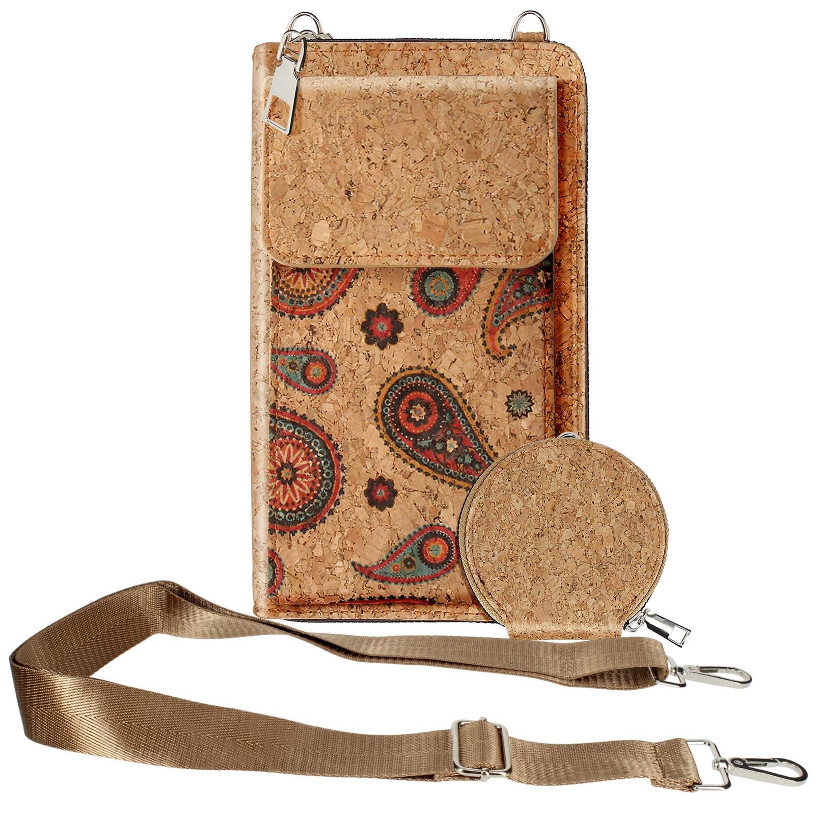 Diese Handytasche ist aus Korkstoff gefertigt und bietet ein einzigartiges und umweltfreundliches Accessoire. Sie verfügt über ein lebhaftes Mandala-Muster auf der Vorderseite, das einen künstlerischen Touch verleiht. Die Tasche ist praktisch gestaltet und verfügt über mehrere Fächer, um wichtige Dinge organisiert aufzubewahren.