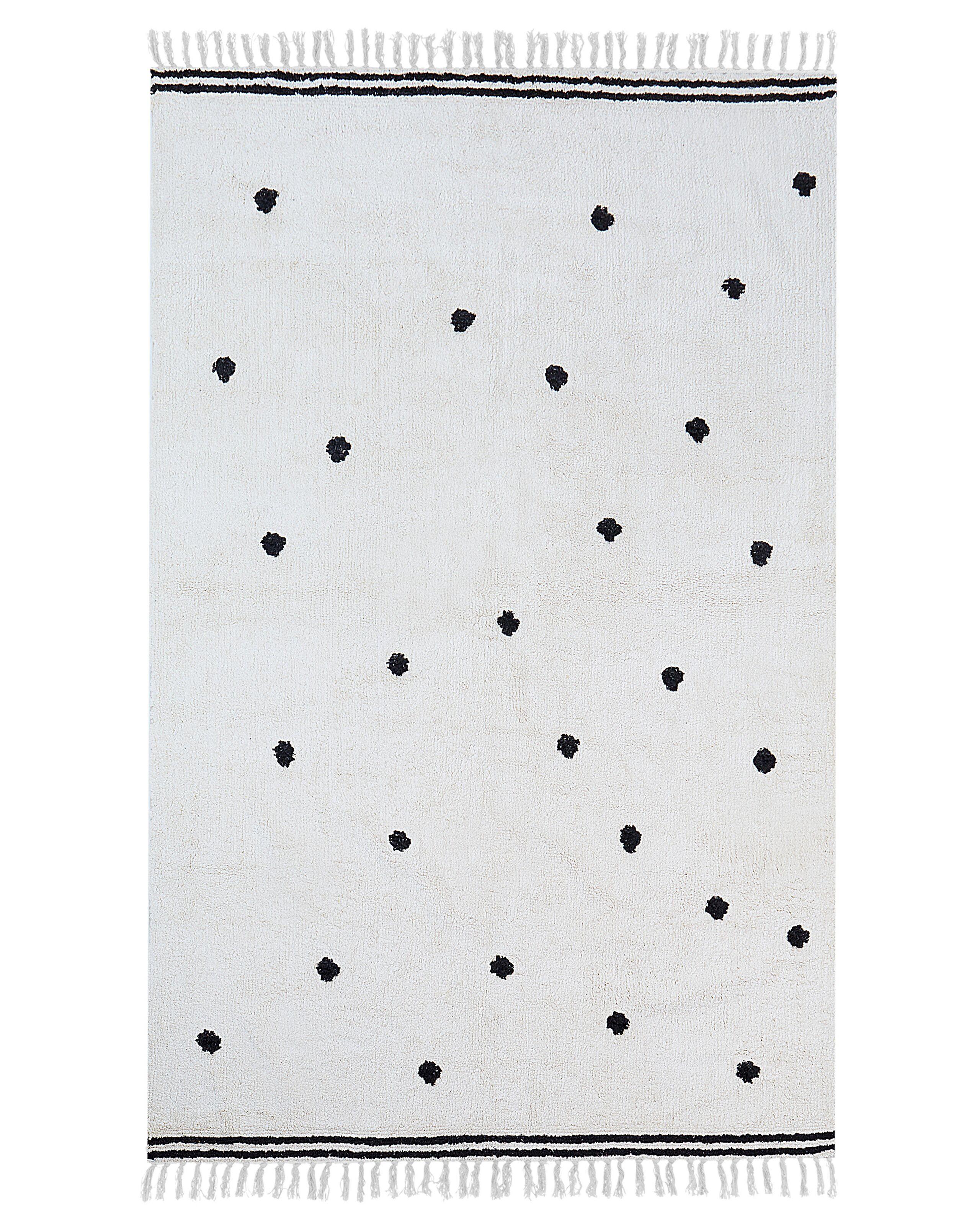 Teppich mit schwarzen punkten und Fransen. Dieser handgefertigte getuftete Teppich ist eine grossartige Dekorationsmöglichkeit für Ihr Zuhause. Das schlichte Design und die weisse Farbe harmonieren perfekt mit den schwarzen Punkten und Streifen und passen zu jedem Einrichtungsstil. Die Quasten an den Seiten des Teppichs verleihen ihm ein einzigartiges Aussehen, und das Baumwollmaterial fühlt sich weich an. Der Teppich passt perfekt in Ihr Wohnzimmer.