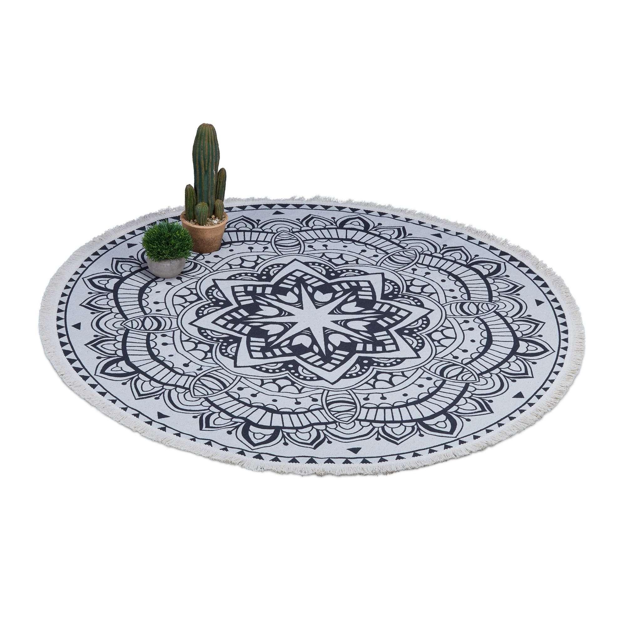 Verschönern Sie Ihr Zuhause mit unserem modernen Baumwoll-Fransenteppich – Komfort und Stil in einem. Dieser runde Teppich aus 100 % Baumwolle verleiht jedem Raum mit seinem filigranen Mandala-Design Eleganz und Wärme.