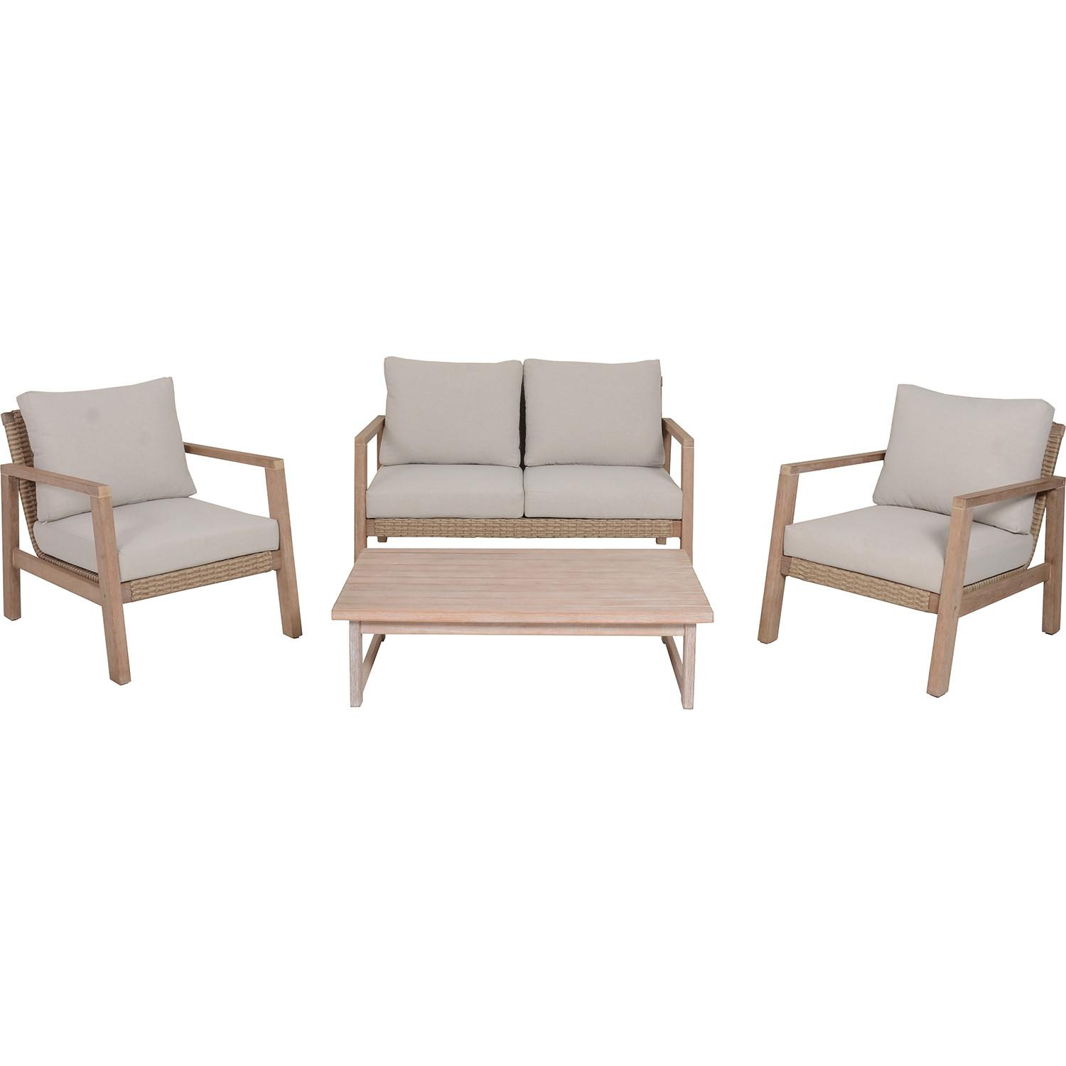 Hergestellt aus 100% FSC-zertifiziertem Eukalyptusholz Strapazierfähiges Kunststoffgeflecht in washed braun/braun Bequeme beigefarbene Polyesterkissen inklusive Elegantes, eckiges Design Set besteht aus einem Tisch, zwei Sesseln und einem Sofa Robuste Konstruktion, Sitz: Maximale Belastbarkeit 120 kg, Tisch: Maximale Belastbarkeit 25 kg Kissenbezüge waschbar bis 30° Verschlussart: Reissverschluss Geölte Holz-Oberfläche für zusätzliche Haltbarkeit und Langlebigkeit