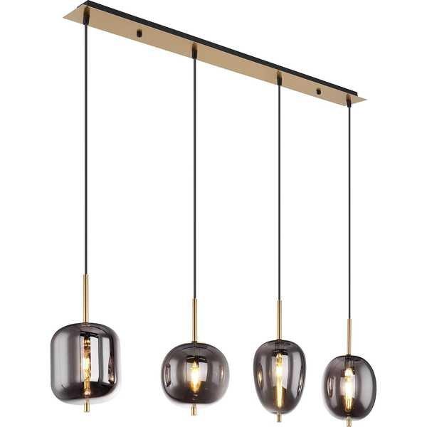 Diese Hängelampe kann durch Ihre längliche Form wunderbar über einen Esstisch platziert werden, der dann eine gleichmässige Ausleuchtung erfährt. Die 110 cm lange Hängeleuchte besteht aus einer rechteckigen, messingfarbenen Metallplatte, an der vier schwarze Kabel mit runden, rauchigen Glasschirmen unterschiedlicher Form hängen, deren Höhe Sie bei der Montage auf bis zu 120 cm anpassen können. Diese sind ebenfalls mit messingfarbenen Metallelementen versehen und können mit E14-Leuchtmitteln Ihrer Wahl bestückt werden, wodurch Sie die Möglichkeit haben, Lichtfarbe und Helligkeit individuell zu bestimmen. Mit dieser Hängeleuchte können Sie in Ihren Innenräumen stilvolle Akzente setzen und das Gesamtbild komplettieren.
