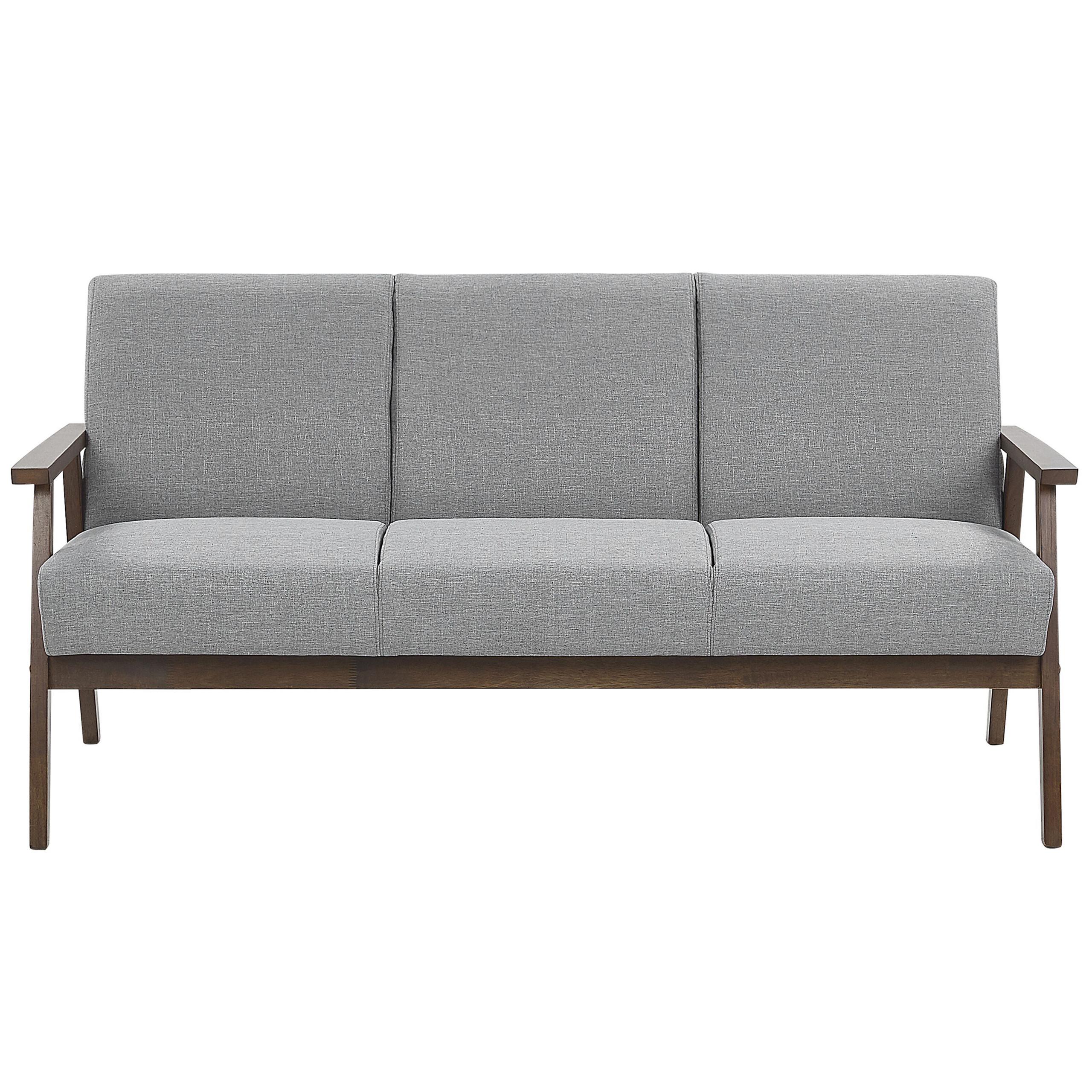 Trendige 3-Sitzer Couch im Retro-Look. Dieser atemberaubende 3-Sitzer nimmt Sie auf eine Zeitreise in die Vergangenheit mit und garantiert Ihnen ein berauschendes Nostalgiegefühl. Die breite und bequeme Sitzfläche aus qualitativem Textilbezug lädt zum Verweilen ein. Die geraden Armlehnen und schmalen Beine aus Gummibaumholz runden den postmodernen Look optisch ab. Dieses Stoffsofa ist eine exzellente Wahl für alle traditionell und stilvoll eingerichteten Wohnräume.