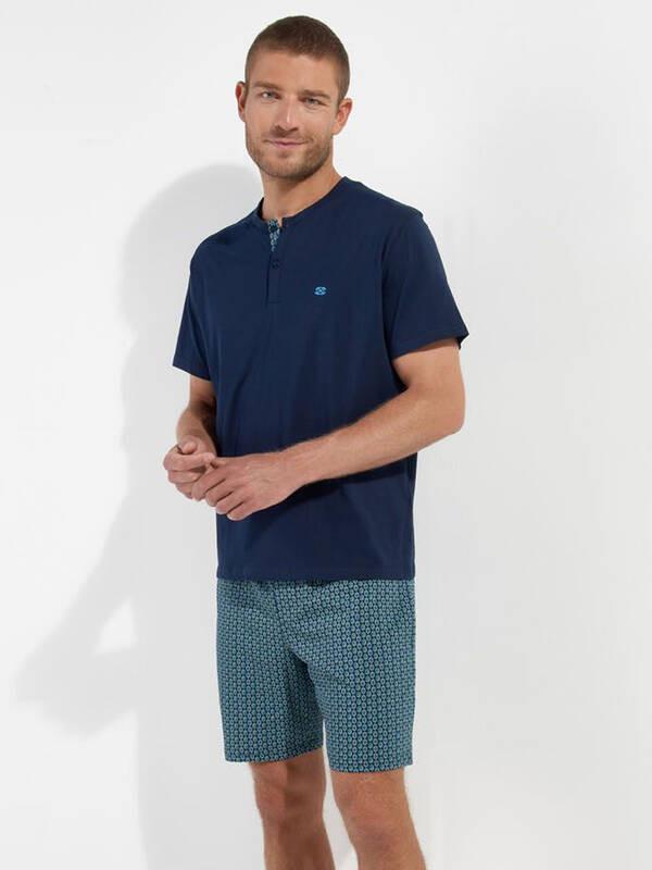 Das Andy Pyjama Set bietet Komfort und Stil für entspannte Stunden zu Hause. Das kurzärmlige Oberteil verfügt über einen klassischen Rundhalsausschnitt mit einer funktionalen Knopfleiste. Die Shorts sind mit einem verspielten geometrischen Muster versehen, das dieser bequemen Nachtwäsche einen besonderen Touch verleiht.