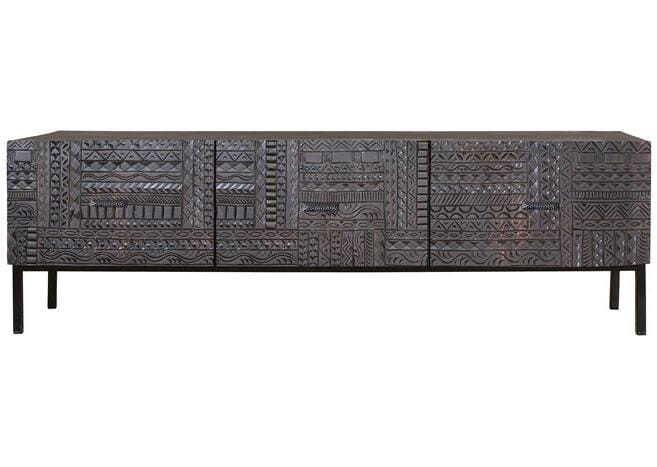 TV-Lowboard aus massivem Mangoholz mit 3 Schubladen. Handgeschnitztes Heroglyphen-Motiv auf den Schubladenfronten. Beine und Griffe sind aus schwarz lackiertem Eisen. Schublade: 35 cm hoch x 60 cm breit. Innenschubladenmasse: 28 cm hoch, 53 cm breit und 28 cm tief. Höhe der Beine: 21 cm. Produkt wird zusammengebaut geliefert.