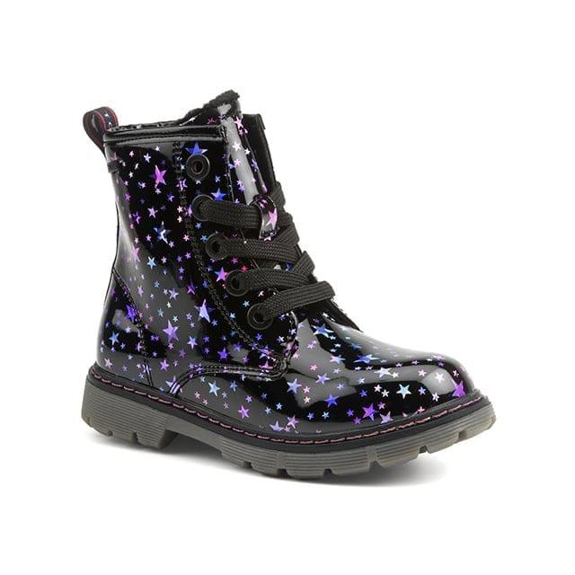 Tom Tailor Obernai Warm Boots sind auf Komfort und Langlebigkeit ausgelegt. Sie verfügen über ein glänzendes schwarzes synthetisches Oberteil, verziert mit mehrfarbigen Sternenmustern in lila und blau. Die Knöchelstiefel haben abgerundete Fersen und sind mit schwarzen Schnürsenkeln ausgestattet, die durch Metallösen für ein sicheres Anziehen geführt werden. Zur einfachen Einstellung befindet sich auf der Rückseite ein Draw-Knopf. Das Innenfutter besteht aus warmem Textil, während die Innensohle auch aus warmem Textil besteht. Die Laufsohle ist aus Gummi, mit einem Fersenmuster für eine bessere Haltbarkeit. Die Stiefeletten sind für den allgemeinen und täglichen Gebrauch konzipiert und bieten Unterstützung und Komfort den ganzen Tag über.