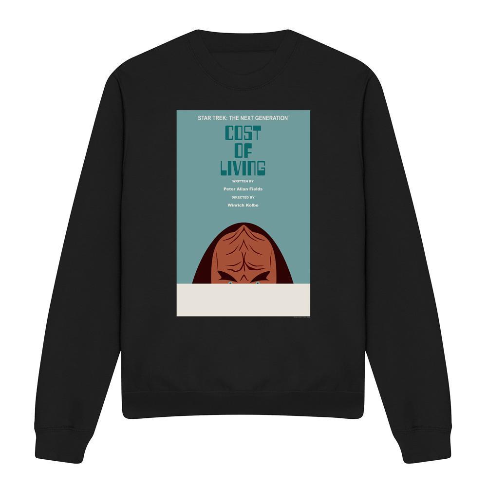 Dieses Sweatshirt zeigt einen grafischen Druck, inspiriert von "Cost of Living", Staffel 5, Episode 20 von Star Trek: The Next Generation. Das Design umfasst den Episodentitel, die Autoren und den Regisseur sowie eine stilisierte Darstellung einer Figur aus der Episode. Dieses bequeme Sweatshirt eignet sich für den Alltag.