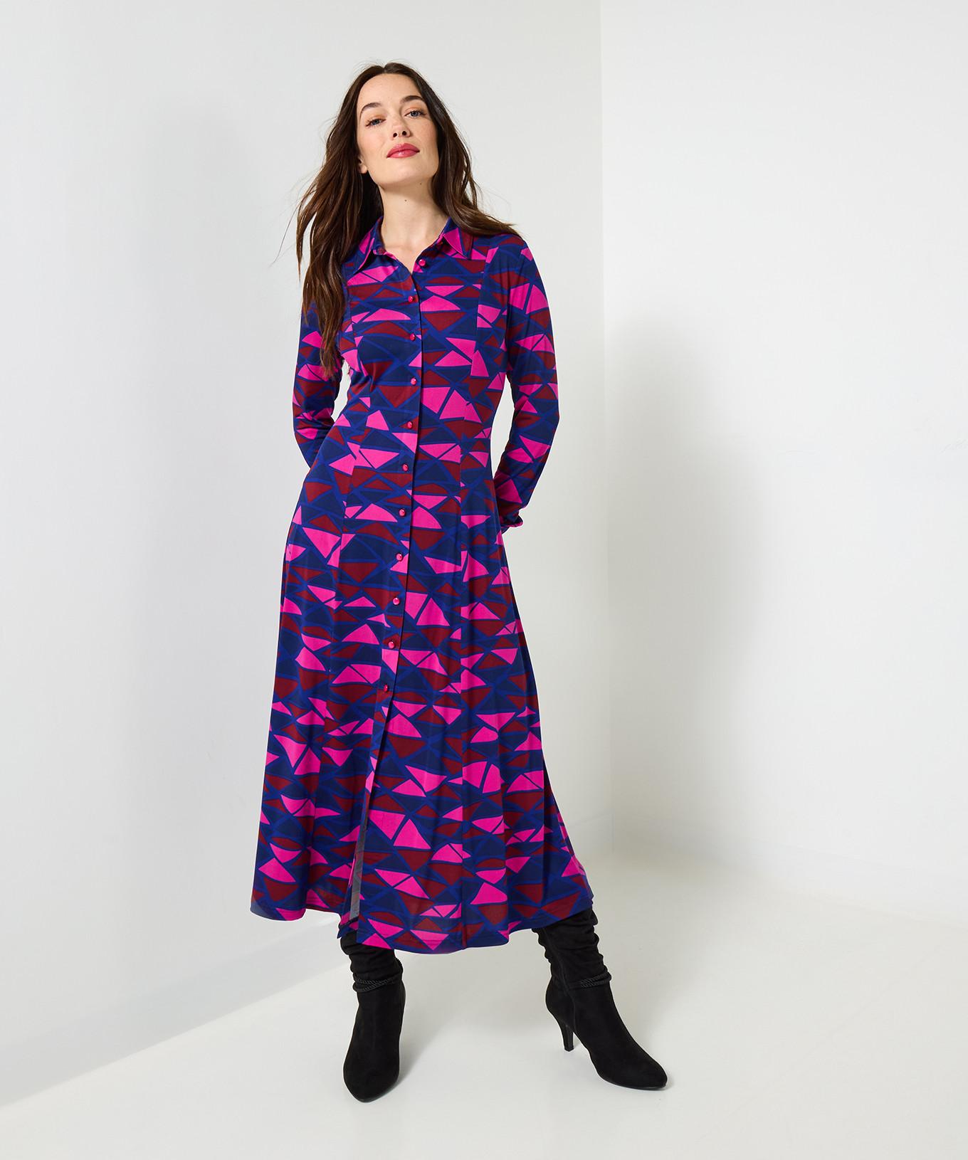Dieses Midikleid im Hemdblusenstil präsentiert sich mit einem auffälligen Retro-Grafikdruck, der klassischen Stil mit modernem Flair verbindet. Das Design umfasst eine durchgehende Knopfleiste und einen klassischen Kragen, was es zu einer vielseitigen Ergänzung für jede Garderobe macht.