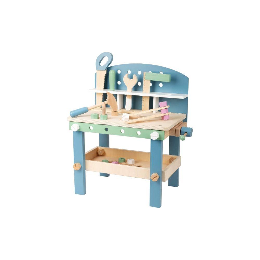 Diese klassische Holz-Werkbank überzeugt mit moderner, skandinavischer Farbgebung und ist ideal für kleine Nachwuchs-Handwerker. Sie misst 40 x 26 x 49 cm und enthält vielseitiges Werkzeug und Zubehör.