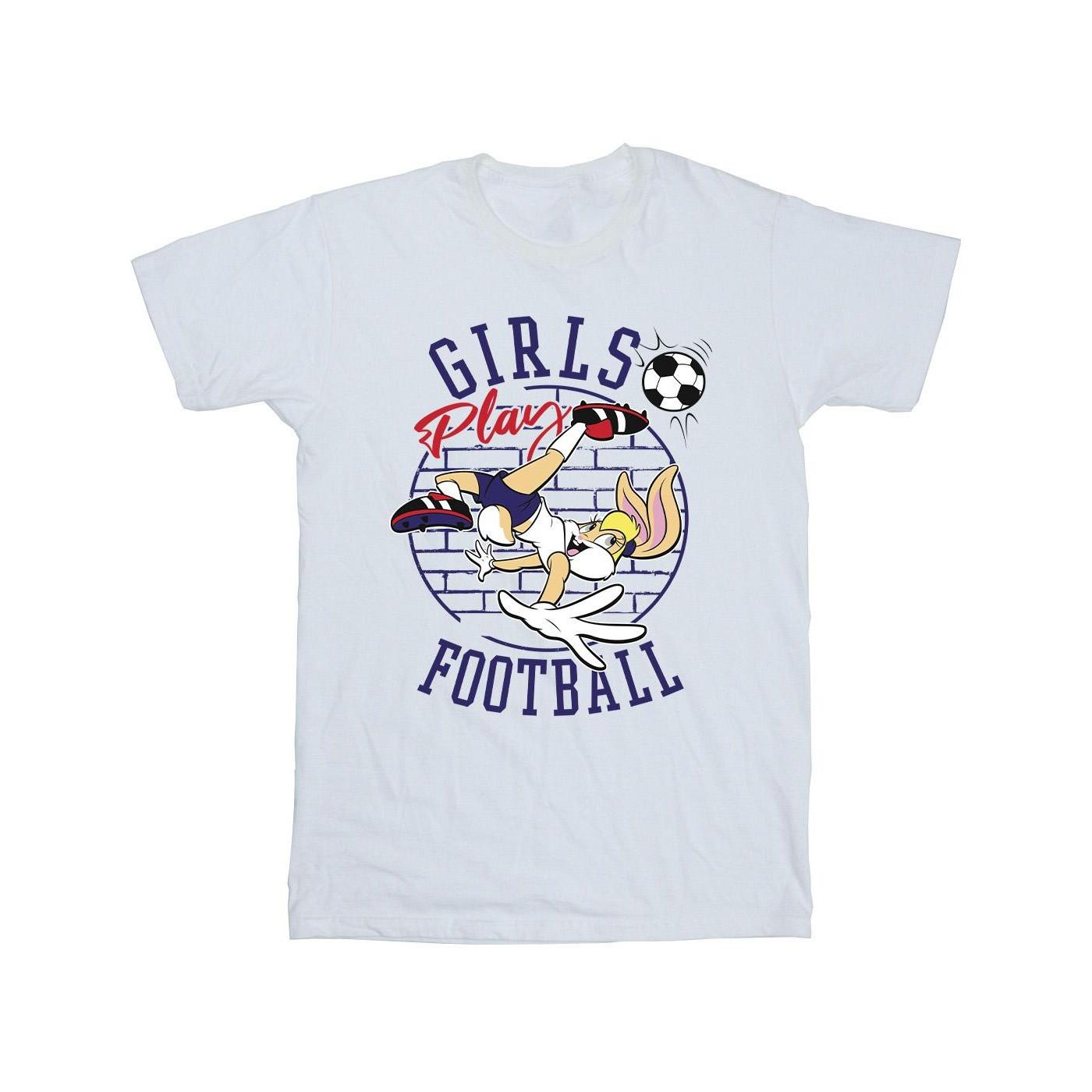 Dieses T-Shirt zeigt einen verspielten Grafikdruck einer weiblichen Zeichentrickfigur, die gekonnt Fussball spielt, begleitet vom Text "GIRLS Play FOOTBALL". Das Design ist vor einem Backsteinmauer-Hintergrund platziert, was der Gesamtästhetik eine dynamische Note verleiht. Dieses T-Shirt ist eine bequeme und stilvolle Wahl für den Alltag.