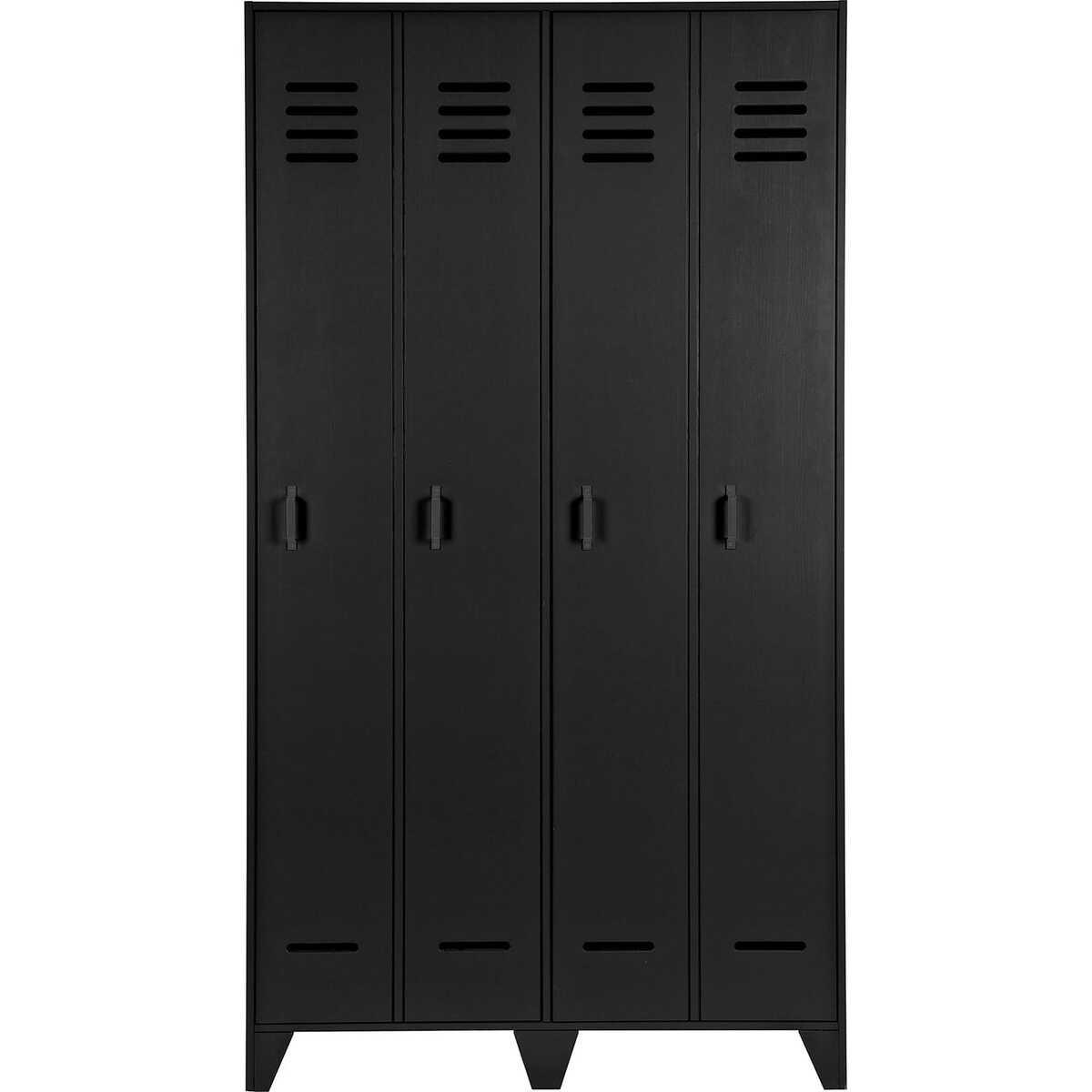 Stijn ist eine neue Serie von Garderobenschränken aus massivem Kiefernholz in den Farben stahlgrau, weiss und schwarz. Dieser geräumige 2-türige Schrank ist ein echtes Stauraumwunder. Hinter jeder Tür befinden sich 4 Einlegeböden. Um den Effekt eines Schliessfachschranks zu erzielen, sieht es so aus, als gäbe es 4 schmale Türen, der besseren Übersicht halber handelt es sich jedoch um zwei grosse Türen. Dieser Schrank ist ideal für das Schlafzimmer, aber auch sehr trendy für ein Büro. Der Schrank wird als einfacher Bausatz mit einer übersichtlichen Montageanleitung geliefert.