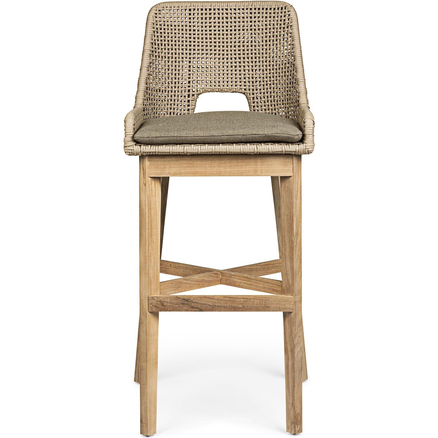 Garten Barhocker Hesperia mit Kissen taupe. Sitz mit pulverbeschichtetem Aluminiumrahmen (Polyester). Olefin-Seilgeflecht (100% Polypropylen). Sitzkissen mit abnehmbarem Bezug aus sonnenbeständigem Olefin-Gewebe (100% Polypropylen). Beine aus Teakholz SVLK (zertifiziertes Holz aus nachhaltiger Forstwirtschaft). Schrauben aus verzinktem Stahl. Beine zur Montage.