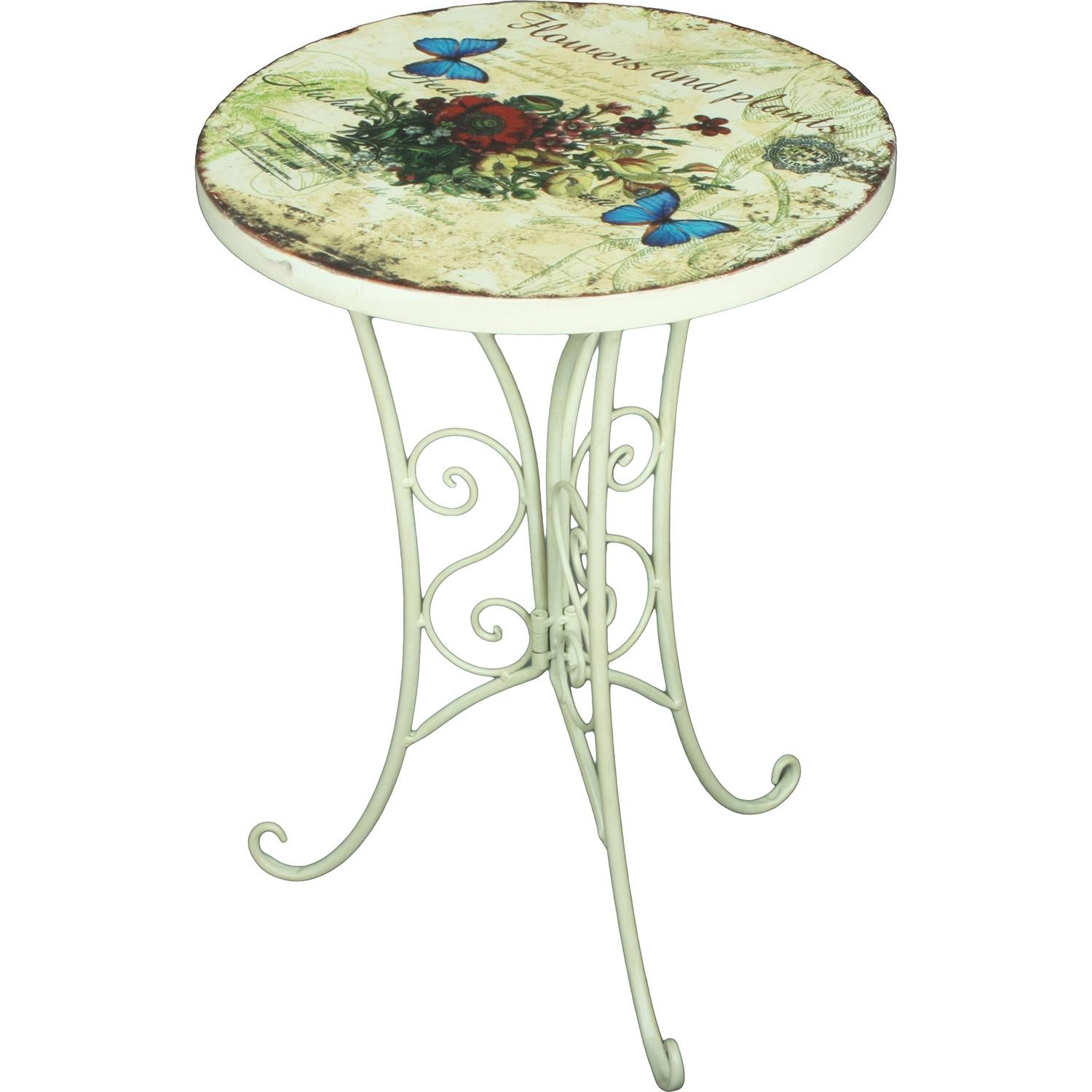 Beistelltisch Floral, ein atemberaubendes Meisterstück, geschmiedet aus widerstandsfähigem Stahl in einem charmanten Altweisston. Zwei prächtige blaue Schmetterlinge und ein farbenfroher Blumenstrauss, aufgedruckt auf der Tischoberfläche, machen dieses Möbel zu einem Einzelstück und verleihen ihm einen unvergleichbaren Charme. Mit drei stabilen Beinen bietet dieses Möbelstück eine robuste Basis und ermöglicht es, eine Vielzahl von Gegenständen darauf abzustellen. Dieser Beistelltisch ist eine wertvolle Ergänzung für jeden Garten und lässt sich dank seines leichten Gewichts mühelos bewegen und an verschiedenen Orten im Freien platzieren. Einfach zu montieren und zu pflegen, kann der Beistelltisch Floral mit einem feuchten Tuch gereinigt und bei Nichtgebrauch platzsparend verstaut werden.