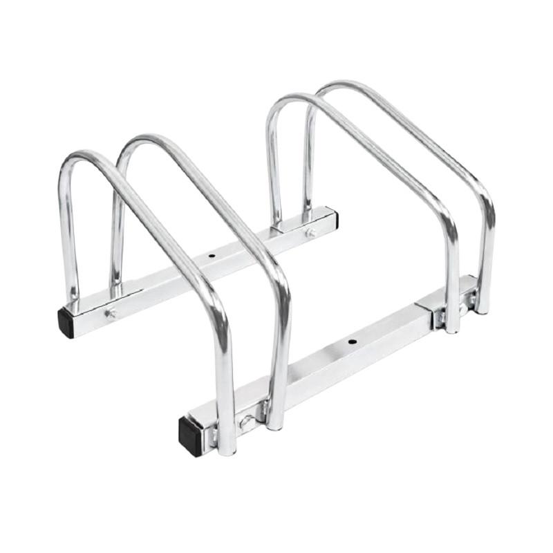 Der Fahrradständer für zwei Fahrräder bietet sichere und platzsparende Aufbewahrung und sorgt für Ordnung. Hergestellt aus langlebigem, wetterbeständigem, verchromtem Stahl, ideal für den Außen- und Innenbereich.