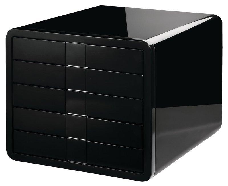 Schubladenbox i-Box mit 5 geschlossenen Schubladen für Papierformate DIN A4/C4 in Premium-Qualität. Einzigartiges, zeitloses, elegantes und innovatives Design in hochglänzender Ausführung für den gehobenen Anspruch in einem repräsentativen Umfeld. Besonders leichtlaufende Schubladen mit Auszugssperre und Griffloch für ein bequemes Entnehmen. Neues patentiertes Beschriftungskonzept mit einer innovativen Clip-Mechanik. Inkl. Beschriftungsschilder. Made in Germany. Aussenmasse (B x T x H): 295 x 355 x 247 mm. Innenmasse der Schubladen (B x T x H): 244 x 325 x 33 mm. Material: hochwertiger Kunststoff (ABS). Farbe des Gehäuses: schwarz. Farbe der Schubladen: schwarz.