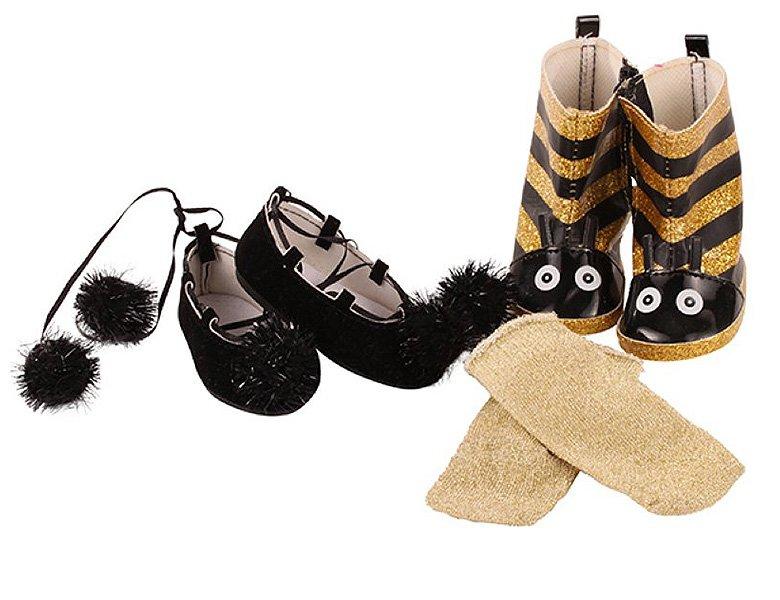 Zwei paar Schuhe und Glitzer-Söckchen für den ausgefallen modischen Style. Die Stiefel sind im Bienchen-Design mit reichlich Glitzer gehalten und setzen ein Statement für jeden Bienenfreund. Ein Hingucker sind auch die schwarzen Ballerinas mit den ausgefallenen Bändern und den Bommeln daran. Zieht die Puppe dann noch die Glitzer-Söckchen dazu an, wird der coole Style perfekt!Mit dem Kauf dieses Sets unterstützt ihr das Projekt