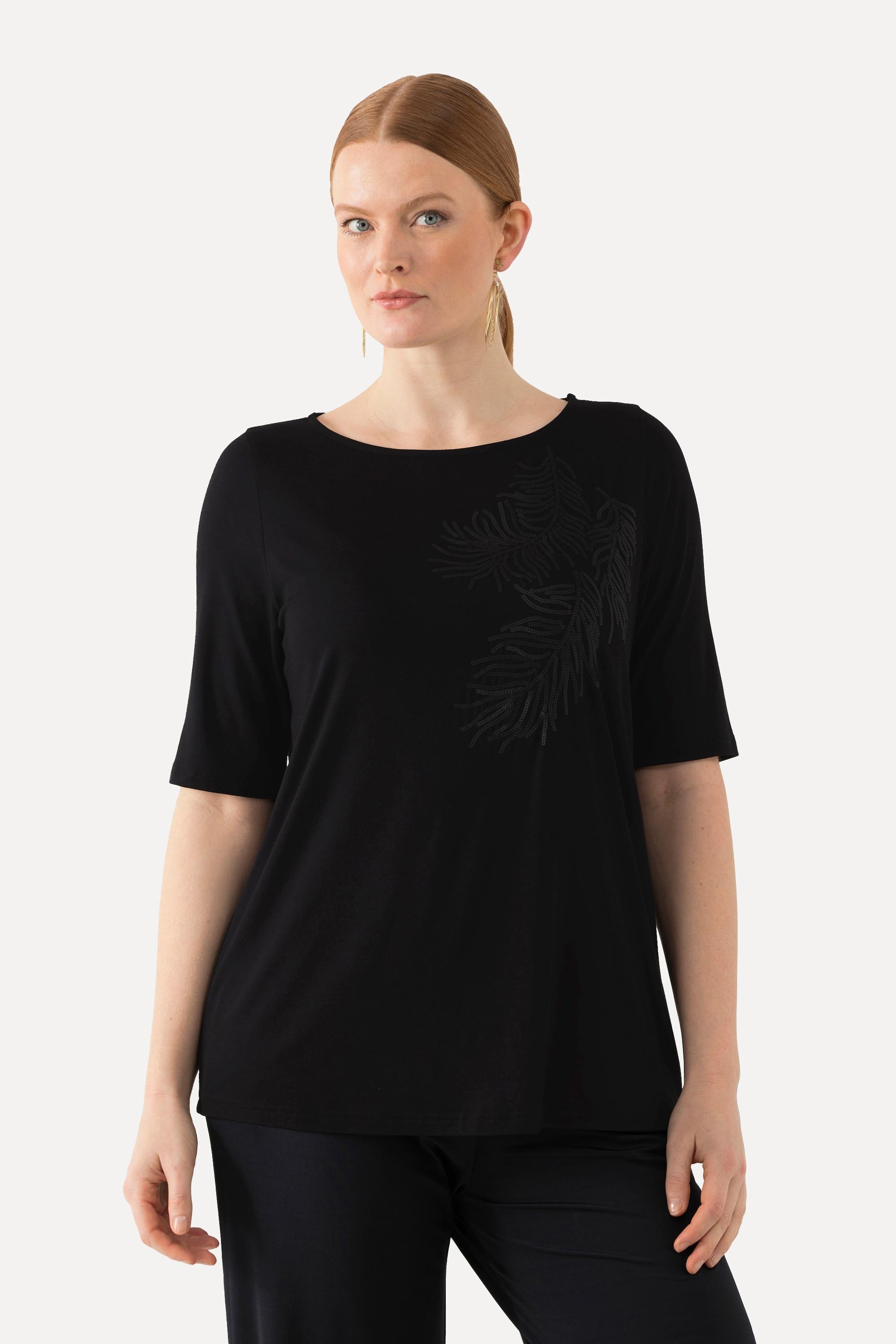 Ulla Popken T-Shirt Pailletten-Blatt U-Boot-Ausschnitt Halbarm