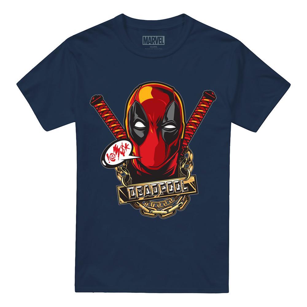 Dieses T-Shirt zeigt einen auffälligen Grafikdruck von Deadpool und ist somit ein herausragendes Stück für Fans. Das Design präsentiert Deadpools ikonische Maske, gekreuzte Katanas und ein goldenes Kettendetail mit dem Namen des Charakters.