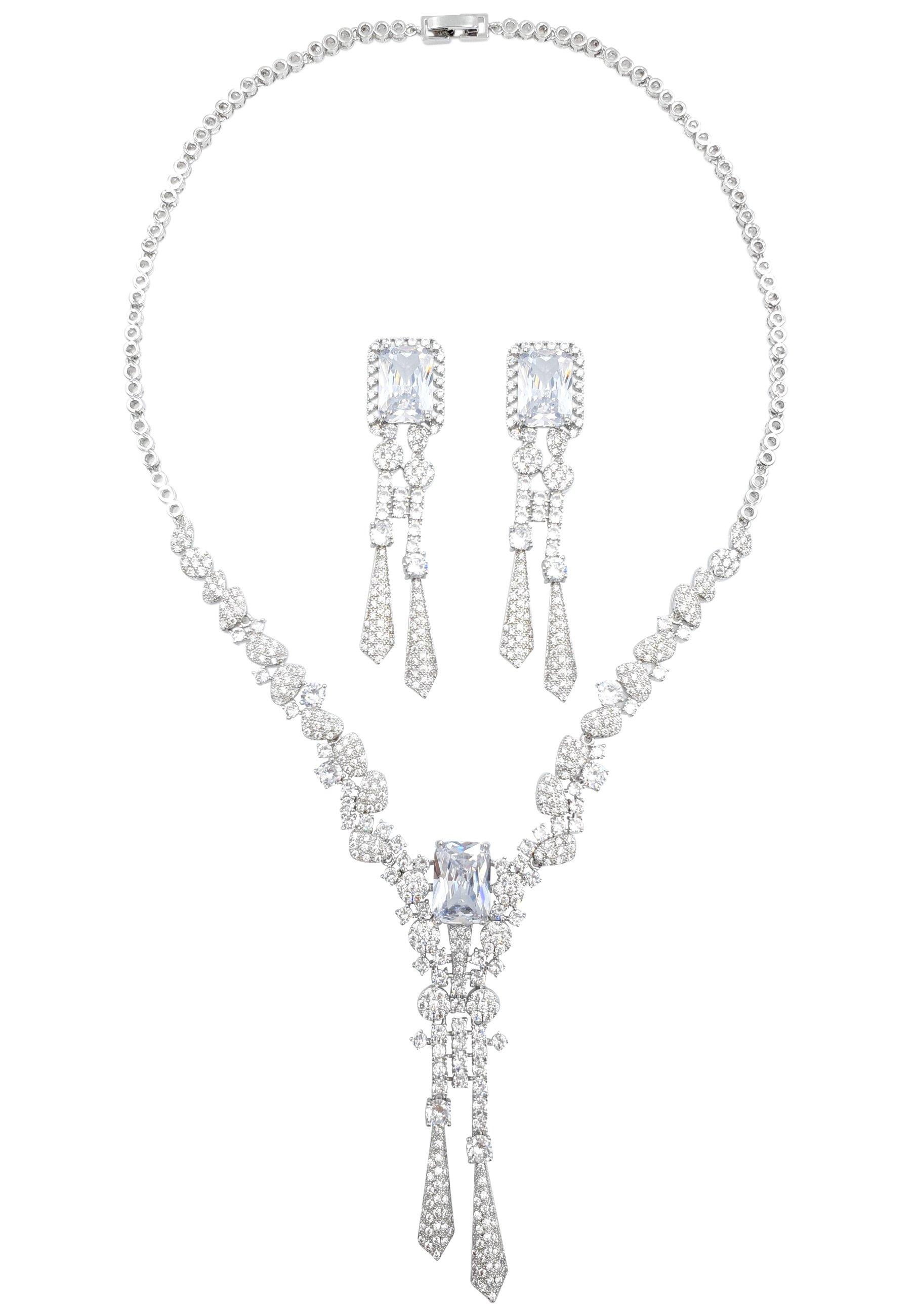 Das elegante Schmuck Set besteht aus einem Collier und Ohrringen. Das Collier sowie die Ohrringe wurden aus weissvergoldetem Messing und Zirkonia hergestellt. Das Collier ist 43 cm lang. Der Anhängerteil des Colliers ist 7.5 cm lang und 1.6 cm breit. Die Ohrringe sind 7.5 cm lang, 1.6 cm breit und wiegen zusammen 17 g (8.5 g pro Ohrring). Der Stift des Ohrrings ist aus Sterling Silber.
