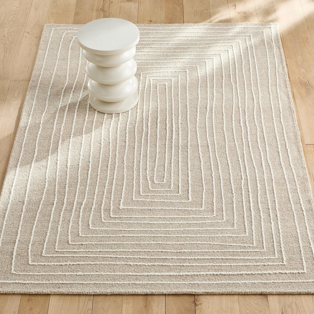Handgetuftet und mit gestickten Linien durchzogen, offenbart Ikar ein grafisches und fesselndes Muster unregelmässiger Konturen. Ein Wollteppich mit Baumwollfutter, der Authentizität mit Modernität kombiniert.