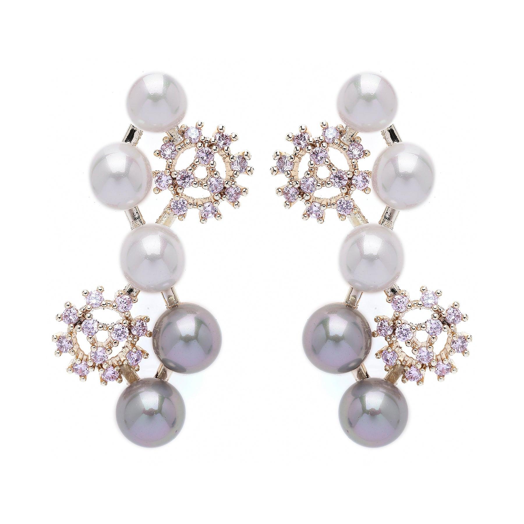 Diese Ohrringe mit ihrer kaskadenartigen Anordnung leuchtender weißer und rosafarbener Perlen, verziert mit zarten rosafarbenen Kristallblüten, strahlen Anmut und Eleganz aus. Sie eignen sich perfekt für besondere Anlässe oder verleihen Ihrem Alltagslook eine raffinierte Note und unterstreichen die zeitlose Schönheit jedes Outfits. Größe: 2,5 cm x 4,4 cm | Beschichtung: Vergoldet | Verschluss: Stecker und Rückseite