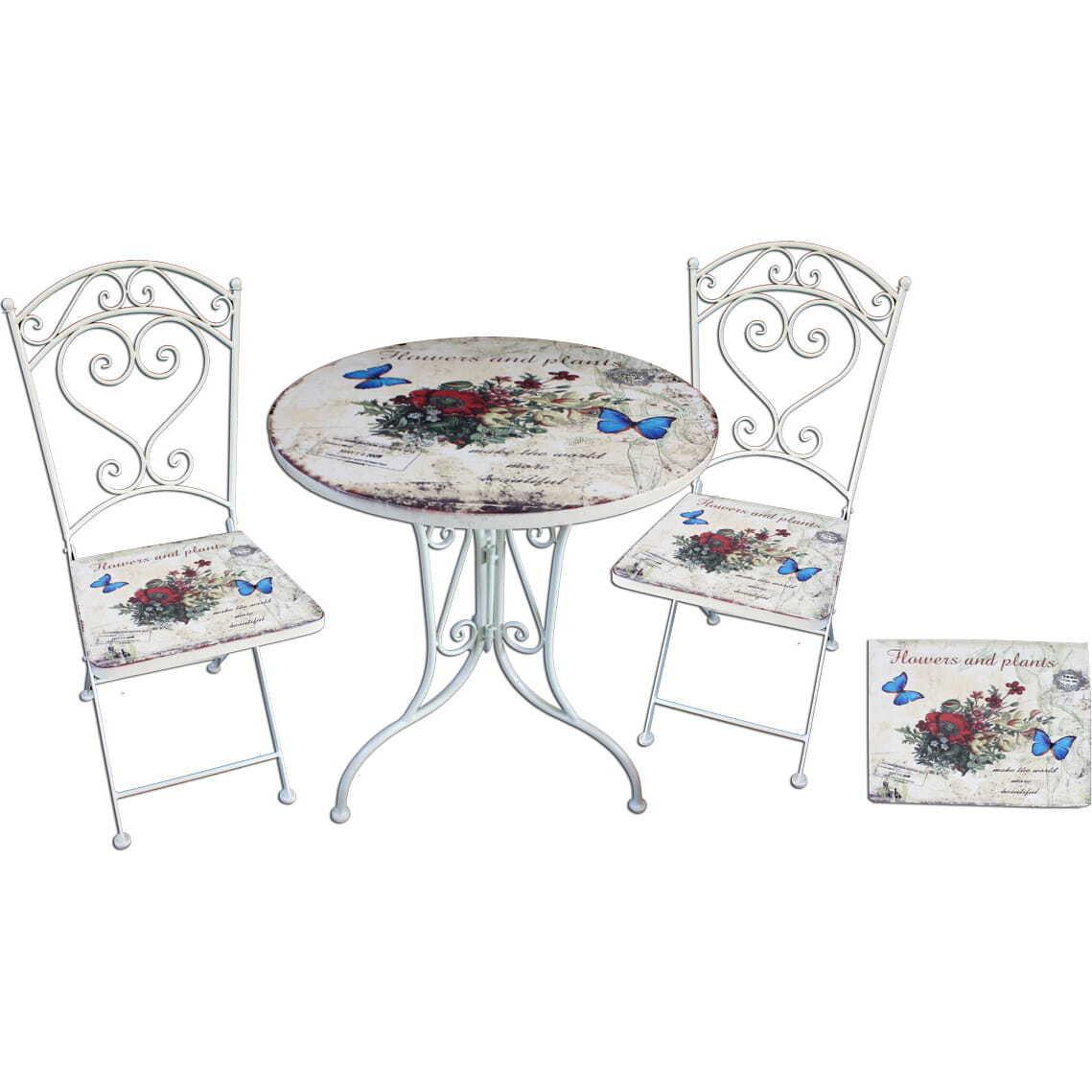 Das Bistro-Set Floral ist ein elegantes Ensemble aus zwei robusten Stahlstühlen und einem passenden Tisch, alle in einem charmanten, altweissen Finish und mit einem zauberhaften Motiv aus blauen Schmetterlingen und einem Blumenstrauss. Dieses Set, gekrönt mit einem liebevoll gefertigten Stahlherz in den Stuhlrücken, verspricht, jeden Aussenbereich, ob Garten, Balkon oder Terrasse, in eine romantische Ruheoase zu verwandeln