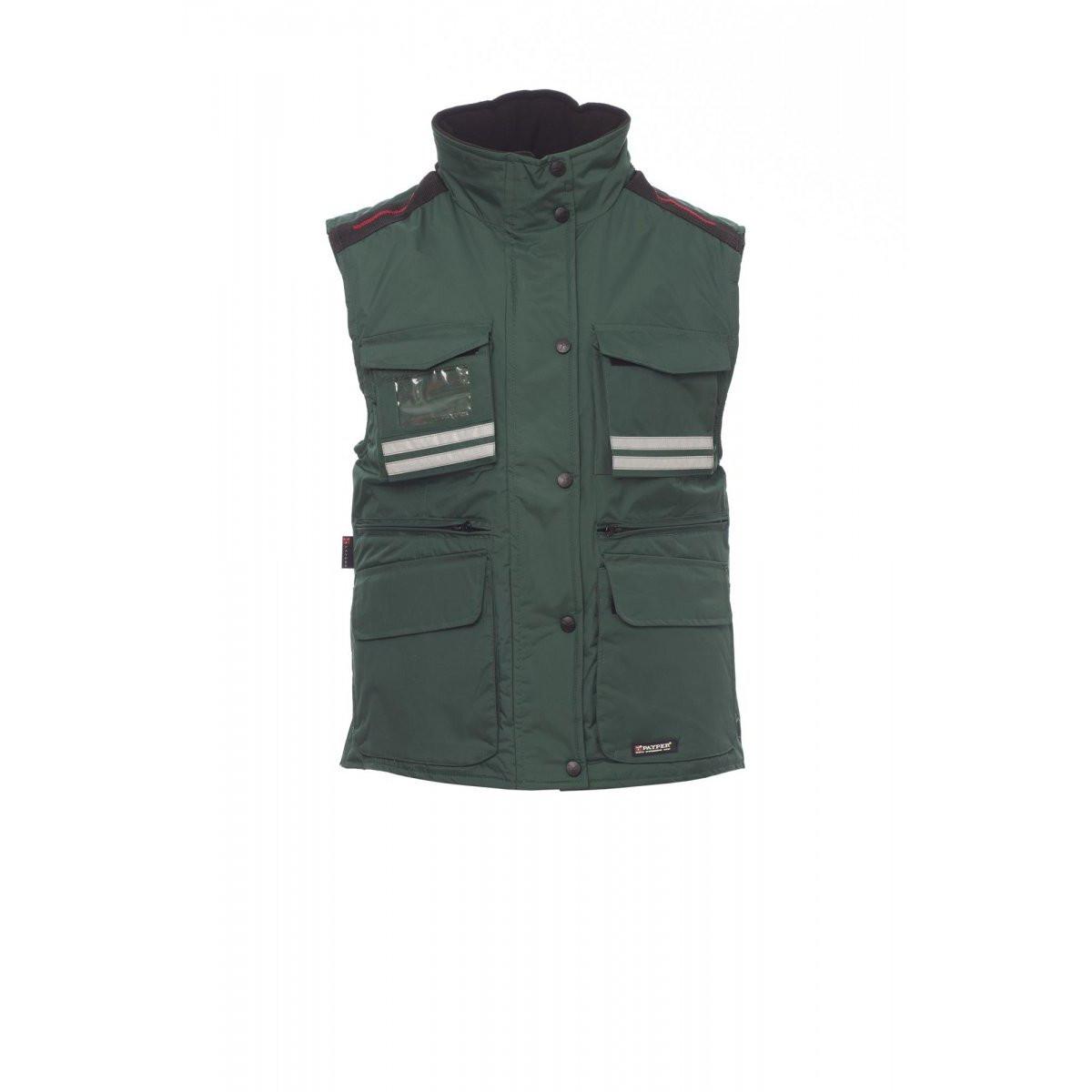 Diese Damenweste verfügt über einen ergonomischen Schnitt und einen 8 mm Kunststoffreissverschluss mit Metallschieber, komplett mit Patte und Kunststoffknöpfen. Die konturierte Kapuze ist abnehmbar und/oder kann im Kragen verstaut werden. Sie ist mit grauen reflektierenden Paspeln vorne und hinten, einem seitlichen Zwickel mit Reissverschluss und neun Aussentaschen ausgestattet, davon zwei LOCK SYSTEM, zwei mit Reissverschluss und verstärktem Innenbereich sowie eine mit einem wendbaren Ausweishalter. Der Innenbereich ist gepolstert mit Mikrofleece an Kragen, Rücken und Nierenwärmer, einem Kordelzug an der Taille und einem inneren Reissverschluss für einfaches Bedrucken und Besticken.