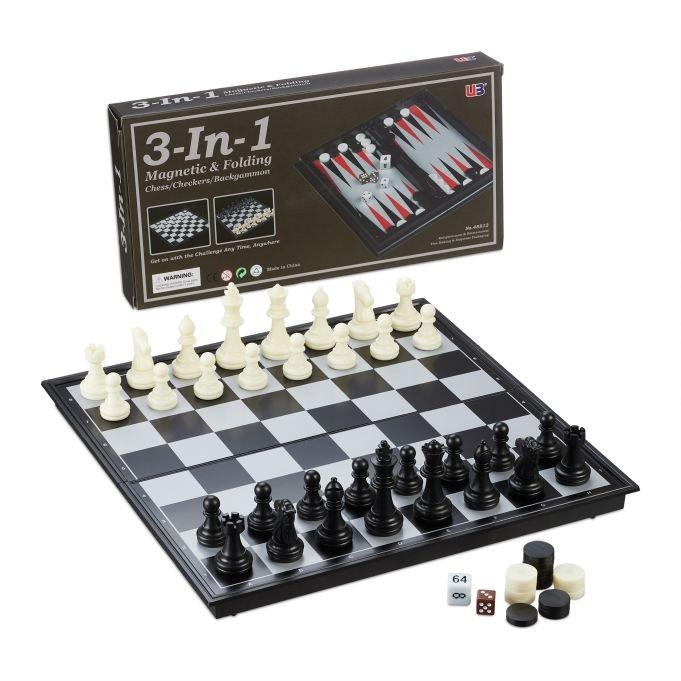 Erleben Sie strategischen Spielspaß für unterwegs mit diesem vielseitigen, faltbaren Schachbrett. Es ist perfekt für unterwegs und vereint Schach, Backgammon und Dame in einem kompakten Set.