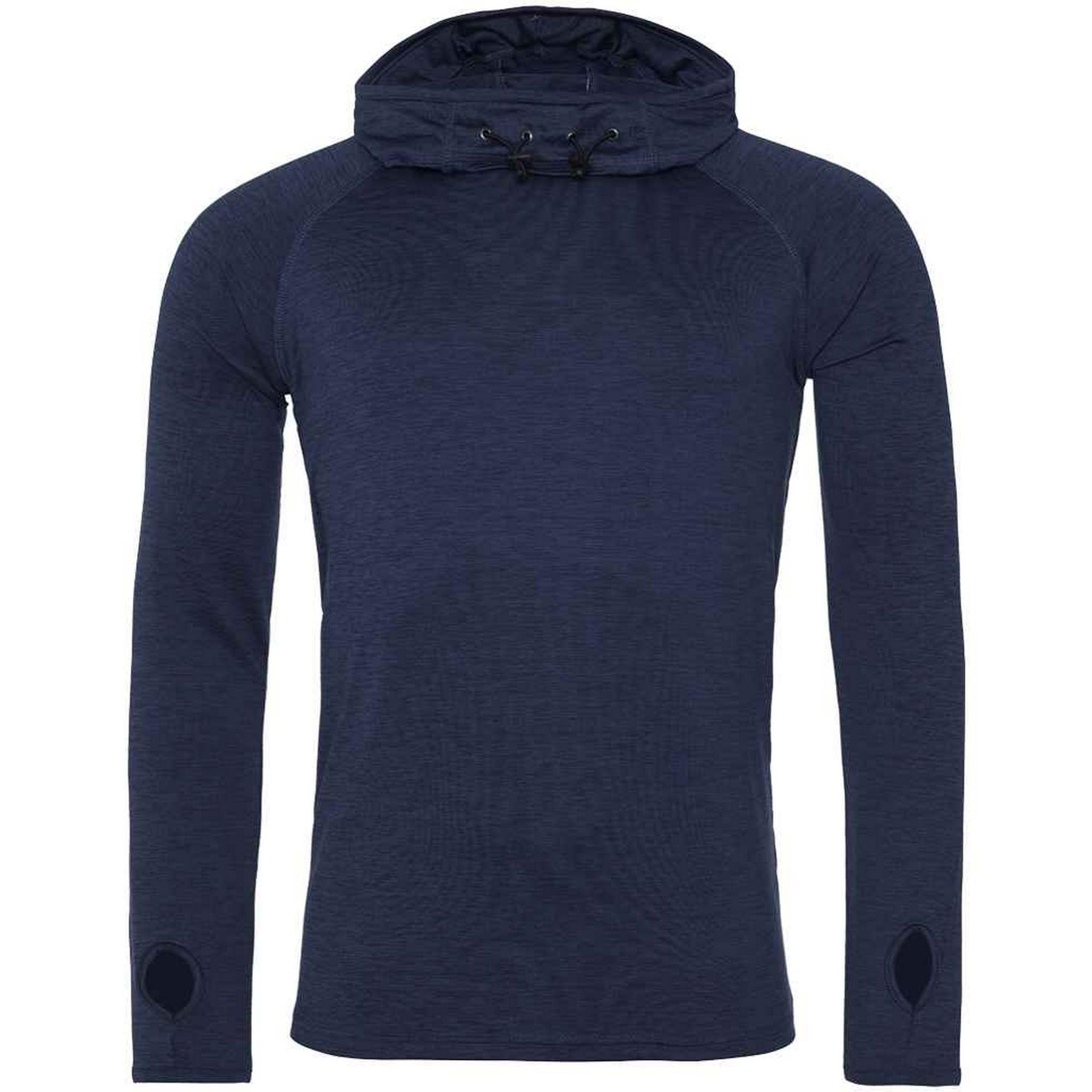 92% Polyester, 8% Elastan. Gewebetechnik: DynamicCool, Leicht. Design: Unifarben. Mit Overlock-Stich, Reflektierende Lasche, Abreiß-Etikett. GSM (Gramm pro Quadratmeter): 210. Nachhaltigkeit: Amfori-Freigabe, BSCI, PETA-geprüftes Vegan, Sedex, WRAP Zertifikat. Wasserfallausschnitt. Langärmlig, Raglanärmel. Bündchen: Daumenloch. Kapuzenmerkmale: Knebel-Einstellung. Saum: Doppelnähte.