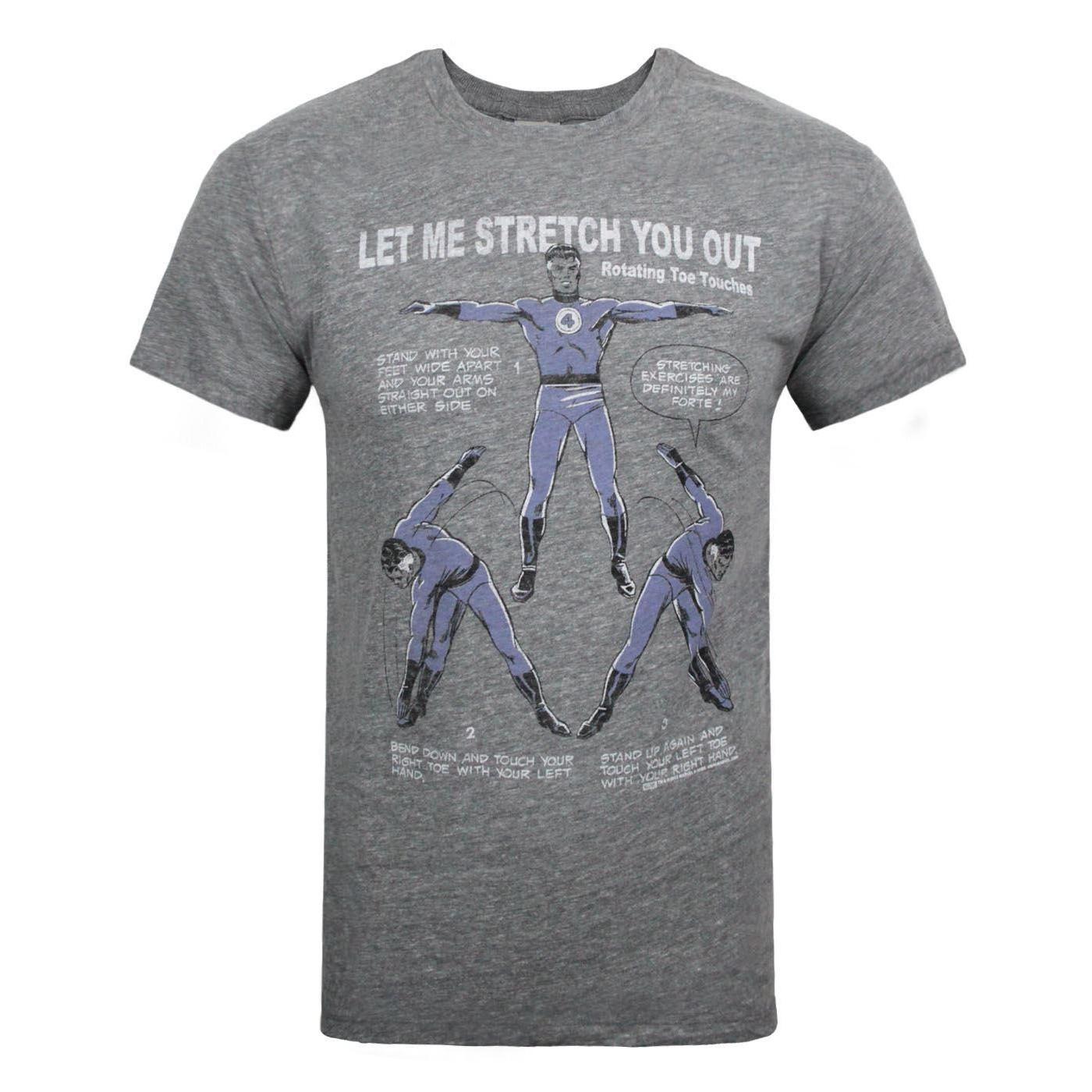 Dieses T-Shirt zeigt eine spielerische Grafik von Mr. Fantastic, der "Rotating Toe Touches" mit Anweisungen demonstriert. Das Design enthält den Satz "LET ME STRETCH YOU OUT" und eine Comic-Illustration des Superhelden in verschiedenen Dehnpositionen. Dieses T-Shirt ist eine lustige Ergänzung für Fans der Fantastic Four.