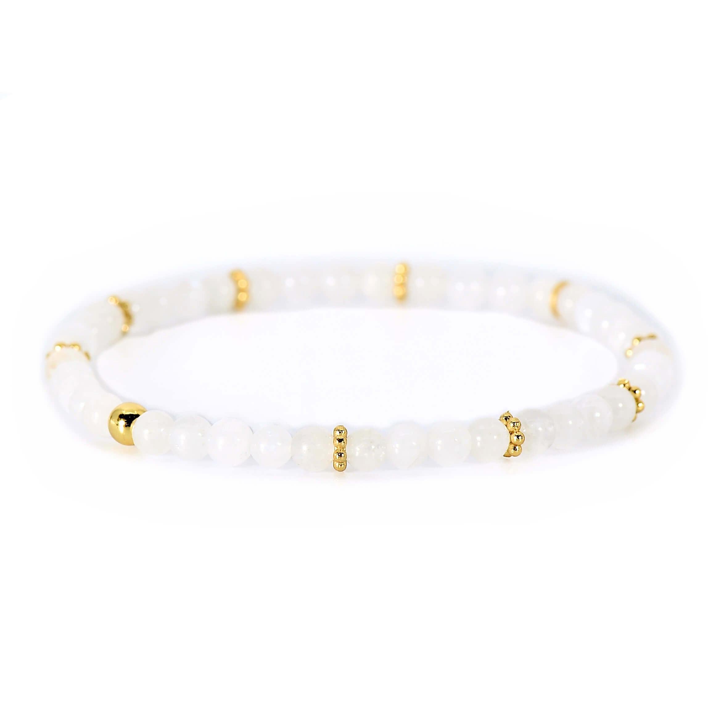 Dieses elegante Damen Stretch-Armband besticht durch die zarten 4mm Regenbogen-Mondsteine, die sanft im Licht schimmern, und das vergoldete Silber, das dem Armband einen edlen Touch verleiht.