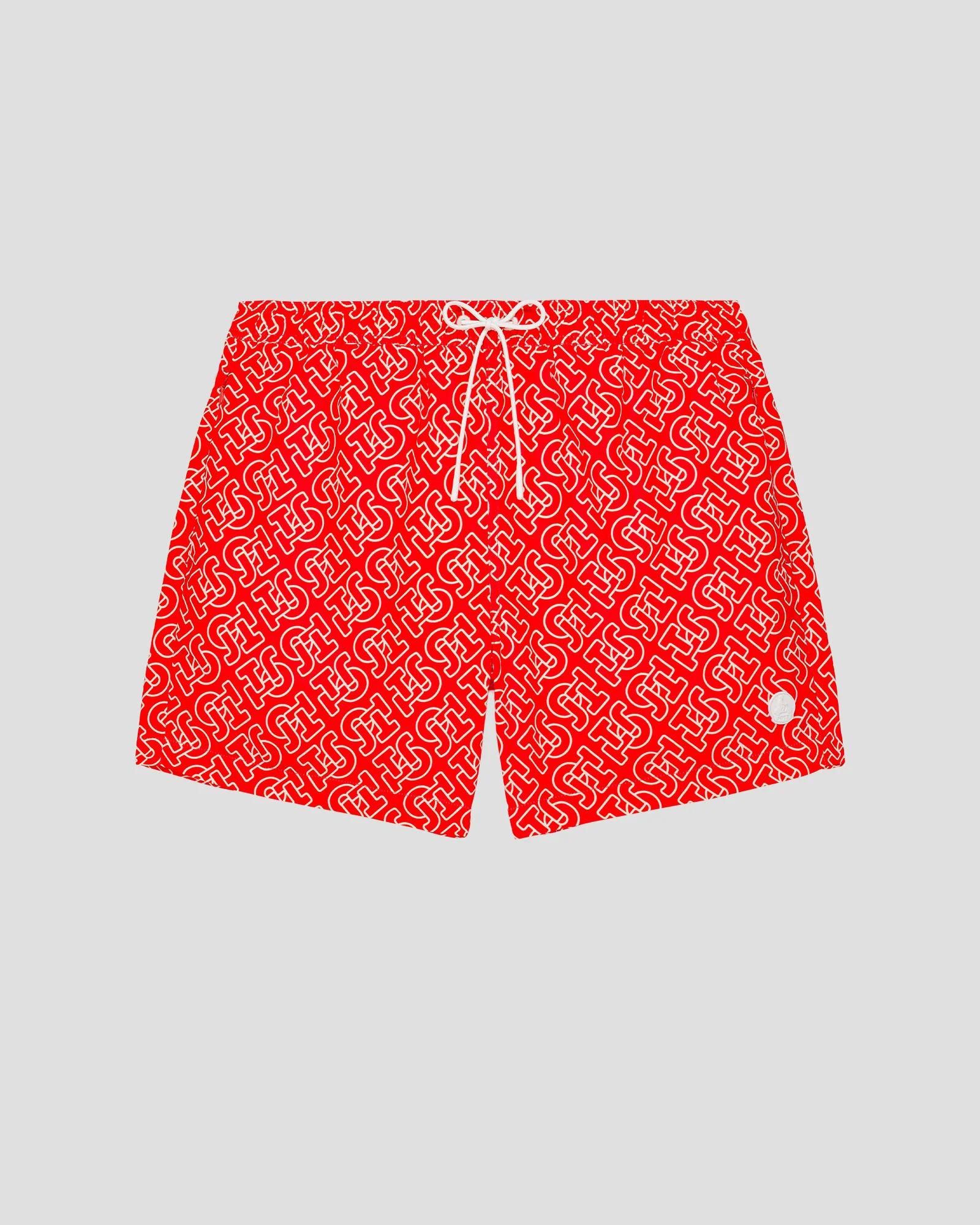 Die Shorts zeichnen sich durch ein stilvolles Design aus stilisierten Buchstaben aus, die sich auf dem Stoff wiederholen und einen angenehmen visuellen Effekt erzeugen. Eine weisse Kordel ist am Bund für eine einfache Passform und einen stilvollen Look platziert. Ein kleines rundes Logo ist auf der unteren rechten Seite, nahe dem Saum, sichtbar und verleiht diesen Badeshorts eine persönliche Note.