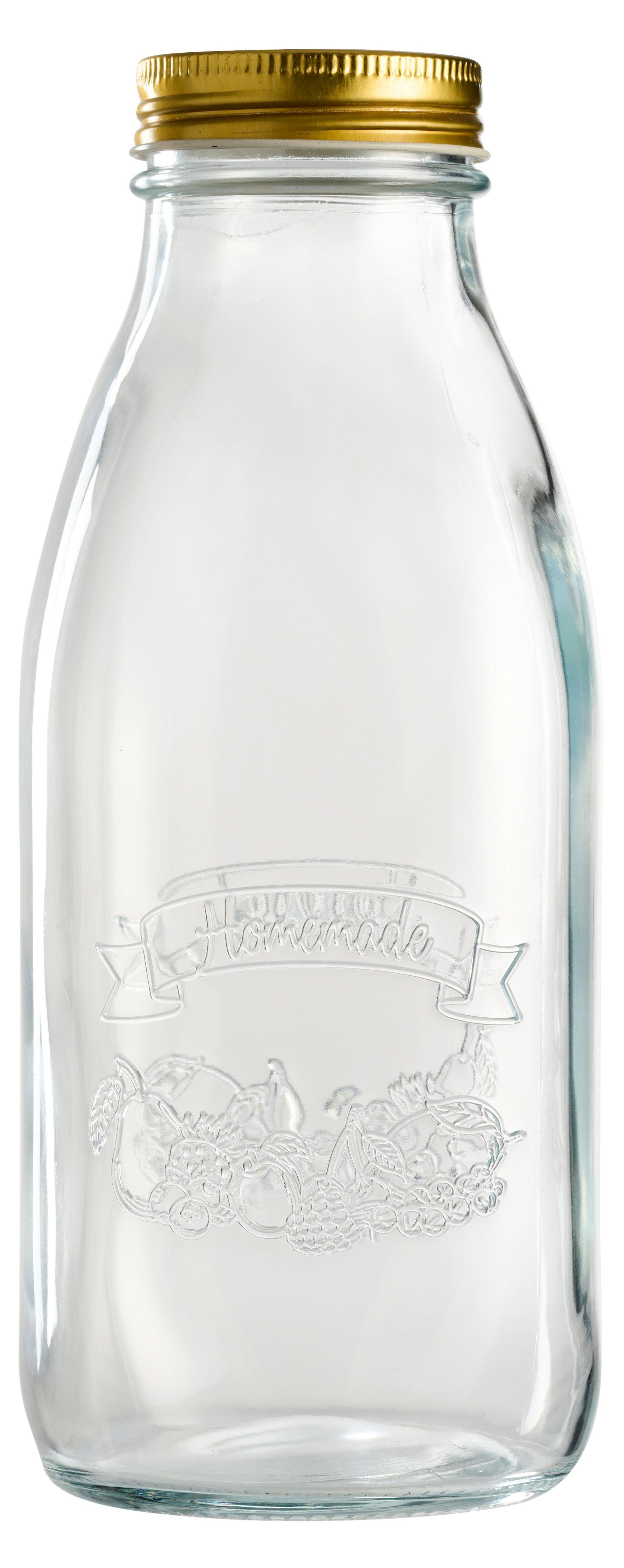 Halten Sie Ihre Saucen frisch und sicher aufbewahrt mit unserer 1L-Flasche mit Deckel! Diese Flasche ist aus Glas und Metall gefertigt und misst Ø9H23 cm. Sie eignet sich perfekt zur Aufbewahrung von Saucen, Saft oder anderen Getränken. Um die Flasche zu sterilisieren, können Sie sie mit kochendem Wasser auffüllen. Vergessen Sie jedoch nicht, die Flasche vorher mit Leitungswasser aufzuheizen, um zu verhindern, dass das Glas bricht. Verpassen Sie nicht die Chance auf eine praktische und sichere Flasche.