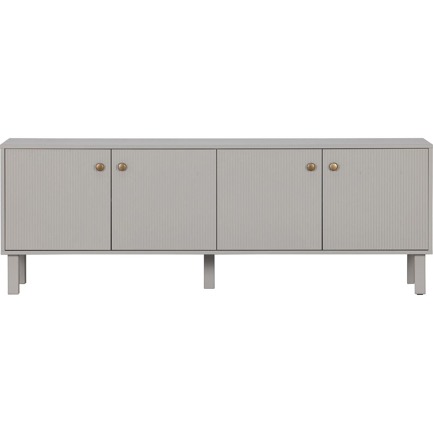 Madu ist ein stilvolles, modernes TV-Lowboard aus Kiefernholz mit wolkengrauer Lackierung. Dadurch erhält das Lowboard ein zeitloses Aussehen. Die goldfarbenen Knöpfe in Kombination mit dem hellen Kiefernholz verleihen dem Schrank zudem einen modernen und robusten Charakter.Madu hat vier Türen mit goldfarbenen Knöpfen. Hinter diesen Türen befinden sich 4 Einlegeböden. Die Zwischenräume haben eine Breite von 76 cm und eine Tiefe von 43 cm.Bei harten Böden legen Sie Filzgleiter unter die Beine. Dadurch wird eine Beschädigung des Bodens verhindert. Der Artikel wird als einfacher Bausatz mit übersichtlicher Montageanleitung geliefert.