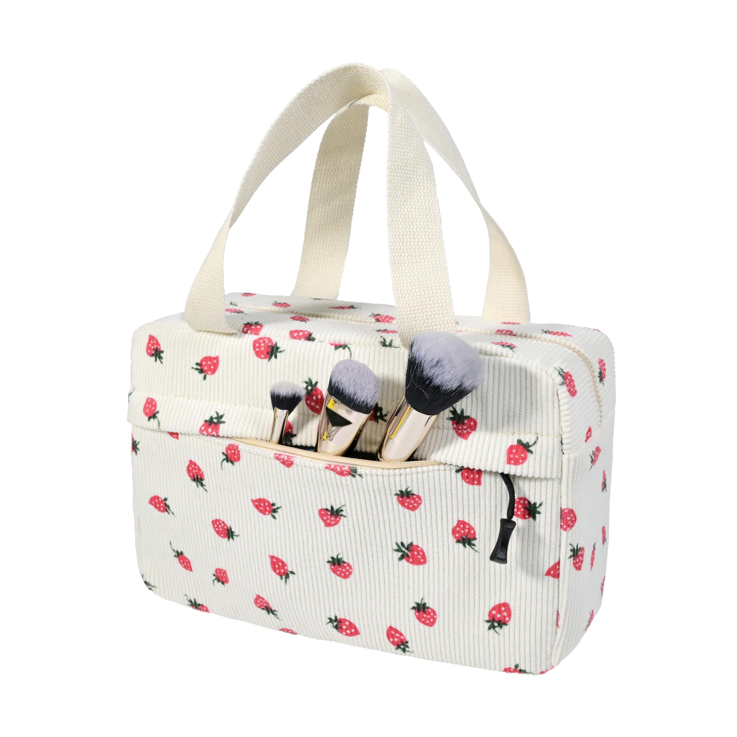 Diese große Kosmetiktasche präsentiert einen charmanten Erdbeer-Print auf Cordstoff und bietet eine stilvolle sowie praktische Lösung zur Organisation von Beauty-Essentials. Das geräumige Design bietet Platz für verschiedene Gegenstände und ist somit ideal für Reisen oder den täglichen Gebrauch.