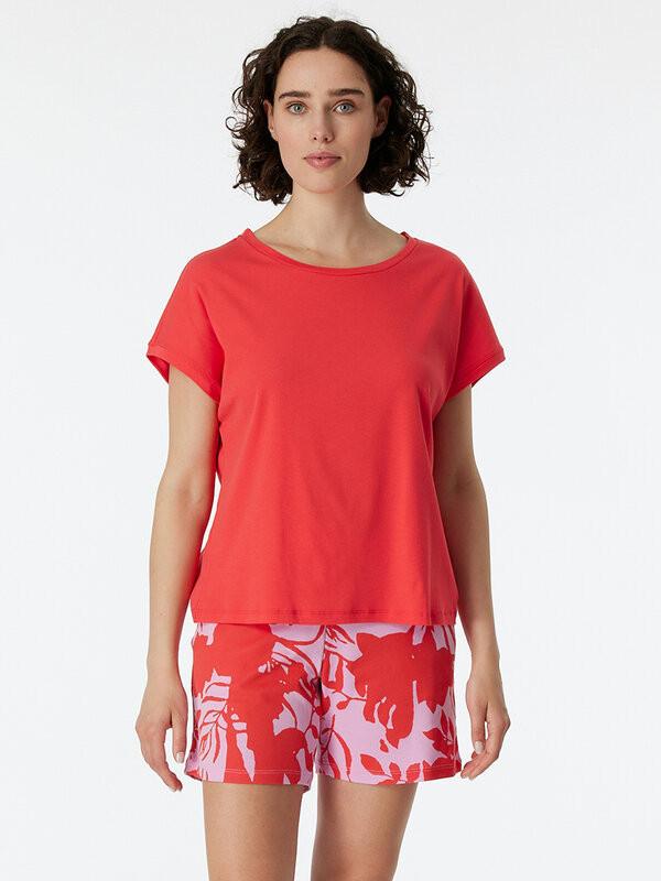 Dieser kurze Pyjama bietet Komfort und Stil für entspannte Stunden zu Hause. Das unifarbene T-Shirt hat einen Rundhalsausschnitt und überschnittene Ärmel und ist aus elastischer Doppelripp-Qualität gefertigt. Die kurze Hose ist mit einem modischen Blumenprint versehen und verfügt über seitliche Taschen, hergestellt aus feiner Interlock-Qualität.