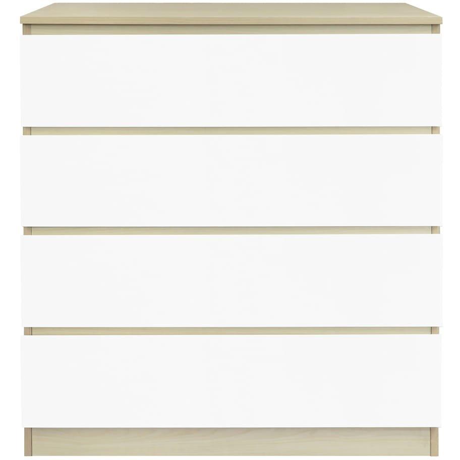 Die zeitlose Kommode im skandinavischen Chic in der Farbkombination natur und weiss lässt sich durch ihre Neutralität mit vielen Stilen kombinieren. Die Kommode bietet in vier Schubladen genügend Platz für Ihre Sachen. Durch ihre Schlichtheit ist sie sehr vielseitig in allen möglichen Räumen verwendbar. In Wohn-, Ess- und Schlafzimmer ist sie praktisch und zweckmässig und wertet dabei den Raum sofort auf.skandinavischer Chicvielseitig verwendbarpflegeleichte OberflächeSchubladen mit Metallauszügen4 grifflose Schubladen