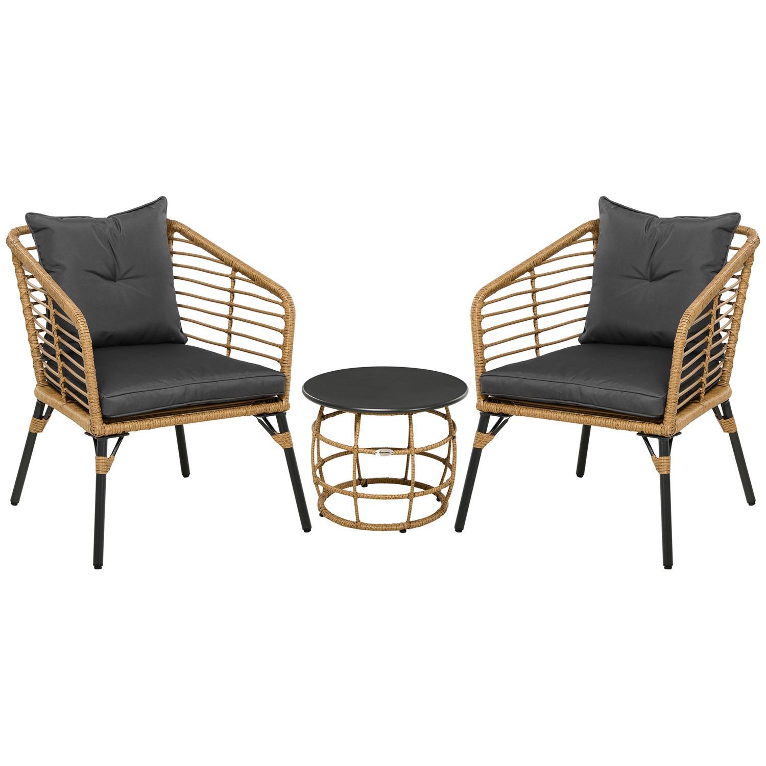 Verbringen Sie Ihre Nachmittage in der Sonne richtig mit diesem Outdoor-Bistro-Set. Bestehend aus drei Teilen zwei großen Sesseln und einem passenden Tisch eignet es sich perfekt zum Entspannen oder zur Unterhaltung mit einem Freund. Die Konstruktion besteht aus einem robusten Stahlrahmen. Jedes Teil ist mit rundem PE-Rattan umwickelt, das witterungsbeständig und pflegeleicht ist.
