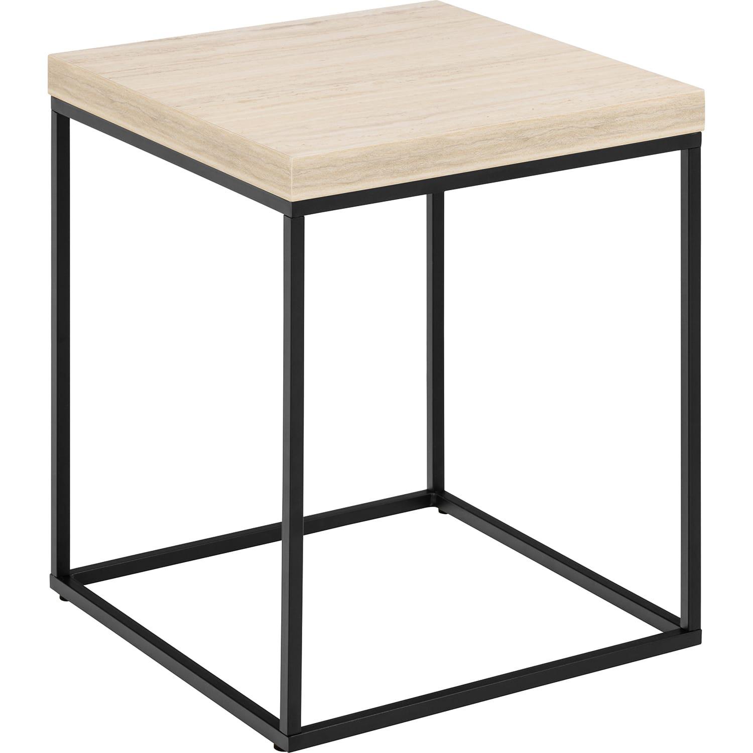 Modernes, quadratisches Design Dicke Tischplatte mit subtilem Travertin-Look Schlanker schwarzer Stahlsockel, pulverbeschichtet FSC zertifiziert für nachhaltige Produktion Travertin rau Papier, Gestell matt schwarz rau pulverbeschichtet Stahl Bodenschutz durch Filzgleiter Maximale Belastbarkeit von 20 kg